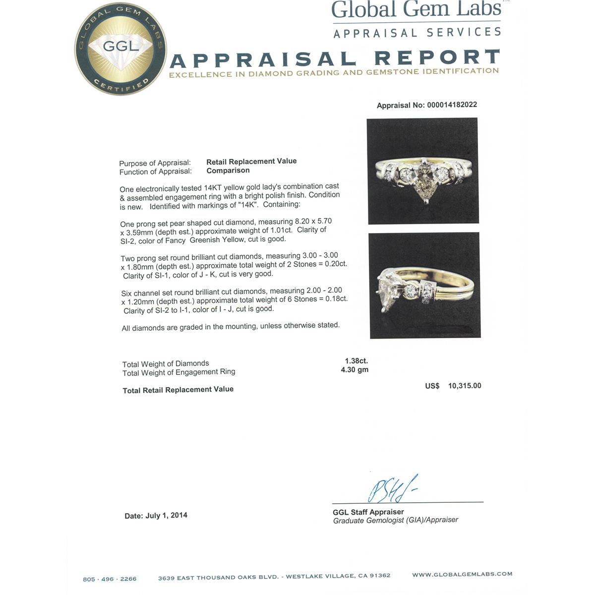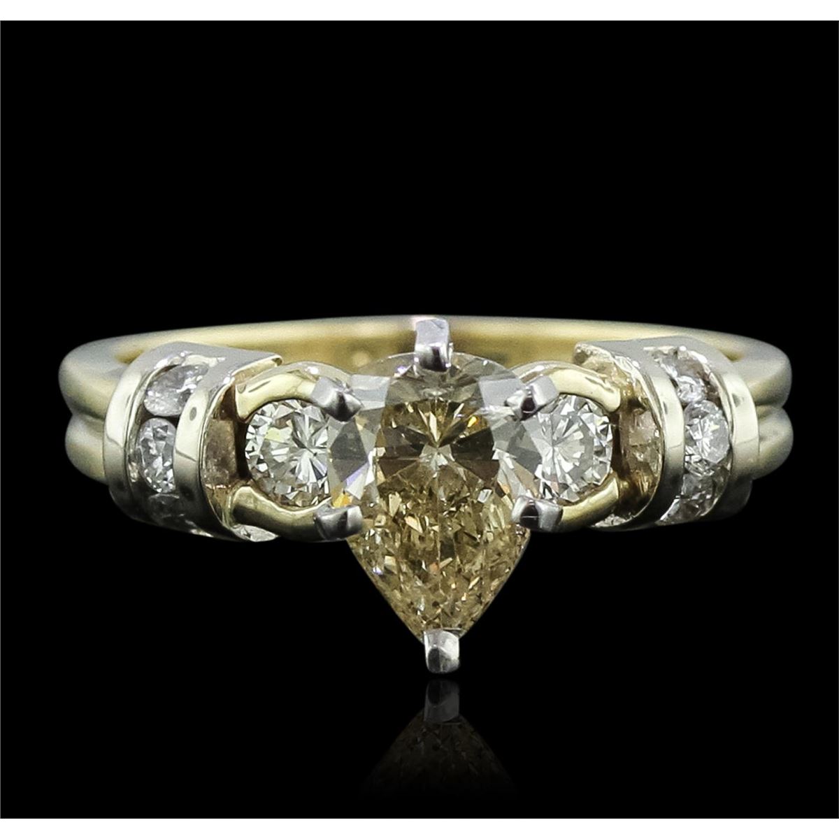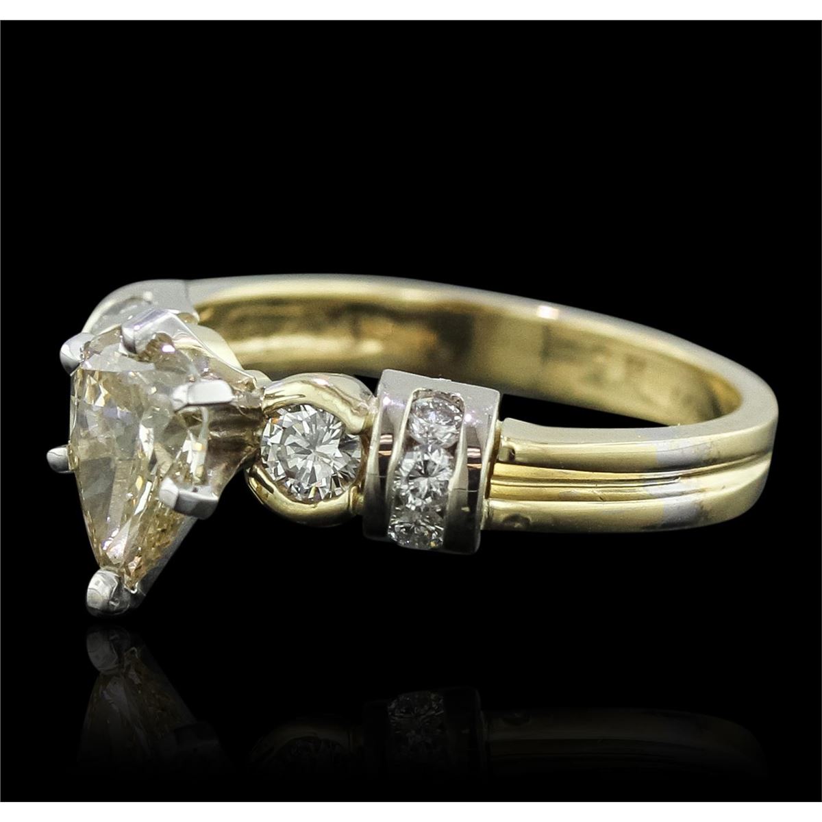 One electronically tested 14KT yellow gold Ladies combination cast & assembled engagement ring with a bright polish finish. Condition is new. Identified with markings of "14K". Containing: One prong set pear shaped cut diamond, measuring 8.20 x 5.70 x 3.59mm (depth est.) approximate weight of 1.01ct. Clarity: SI-2, Cut is Good. Two prong set round brilliant cut diamonds, measuring 3.00 - 3.00 x 1.80mm (depth est.) approximate total weight of 2 Stones = 0.20ct. Clarity: SI-1. Color: J - K, Cut is Very Good. Six channel set round brilliant cut diamonds, measuring 2.00 - 2.00 x 1.20mm (depth est.) approximate total weight of 6 Stones = 0.18ct. Clarity: SI-2 to I-1. Color: I - J, Cut is Good. All diamonds are graded in the mounting, unless otherwise stated. Total Weight of Diamonds 1.38ct. Total Weight of Engagement Ring 4.30 grams. GGL Appraised at $10,315.00.