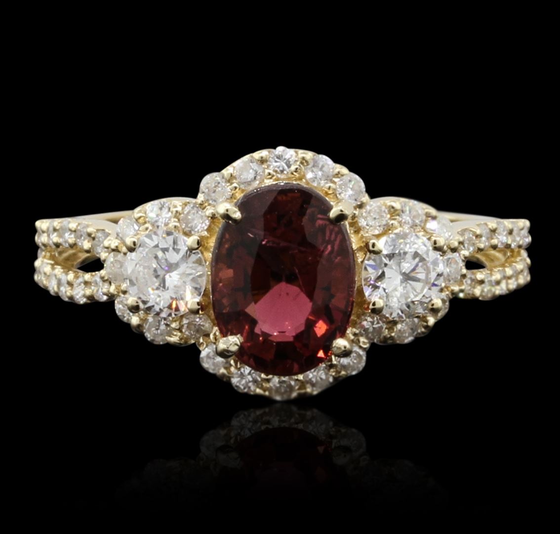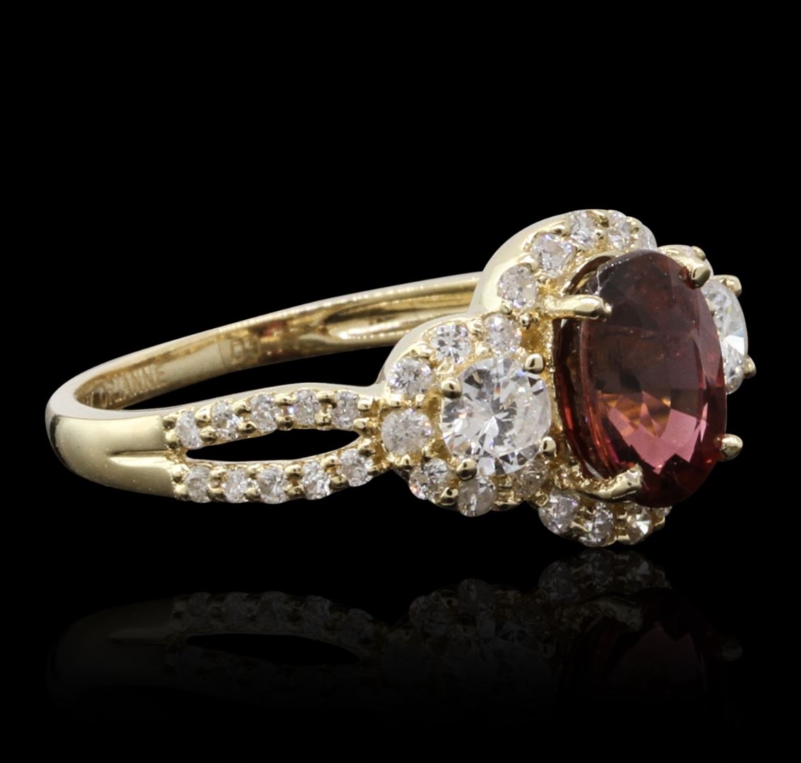 One electronically tested 14KT yellow gold ladies cast tourmaline and diamond ring with a bright polish finish. Condition is new, good workmanship. The featured tourmaline is set within a diamond bezel accented by a single diamond on either side supported by diamond set split shoulders, completed by a one and one-half millimeter wide band. Trademark is ORIANNE. Identified with markings of "14K". Containing: One prong set oval mixed cut natural rubellite, measuring 7.80 x 6.00 x 4.50mm, 8%. bulge factor, approximate weight of 1.42ct., clarity is slightly included, type III, medium dark, very slightly brownish, strongly purplish red color, (GIA stpR 6/3), cut is good. Transmitting light with a minimum of distortion, transparent. Naturally occurring internal & external characteristics are present. Graded in the setting. Forty-Six prong set round brilliant cut diamonds approximate. Total Weight of 46 Stones = 0.77ct. Graded in the setting. Clarity: SI-1 to I-1. Color: G - I. Total Weight of Colored Stones 1.42ct. Total Weight of Diamonds 0.77ct. Total Weight of Ring 2.74 grams. AIG Appraised at $3,690.00.