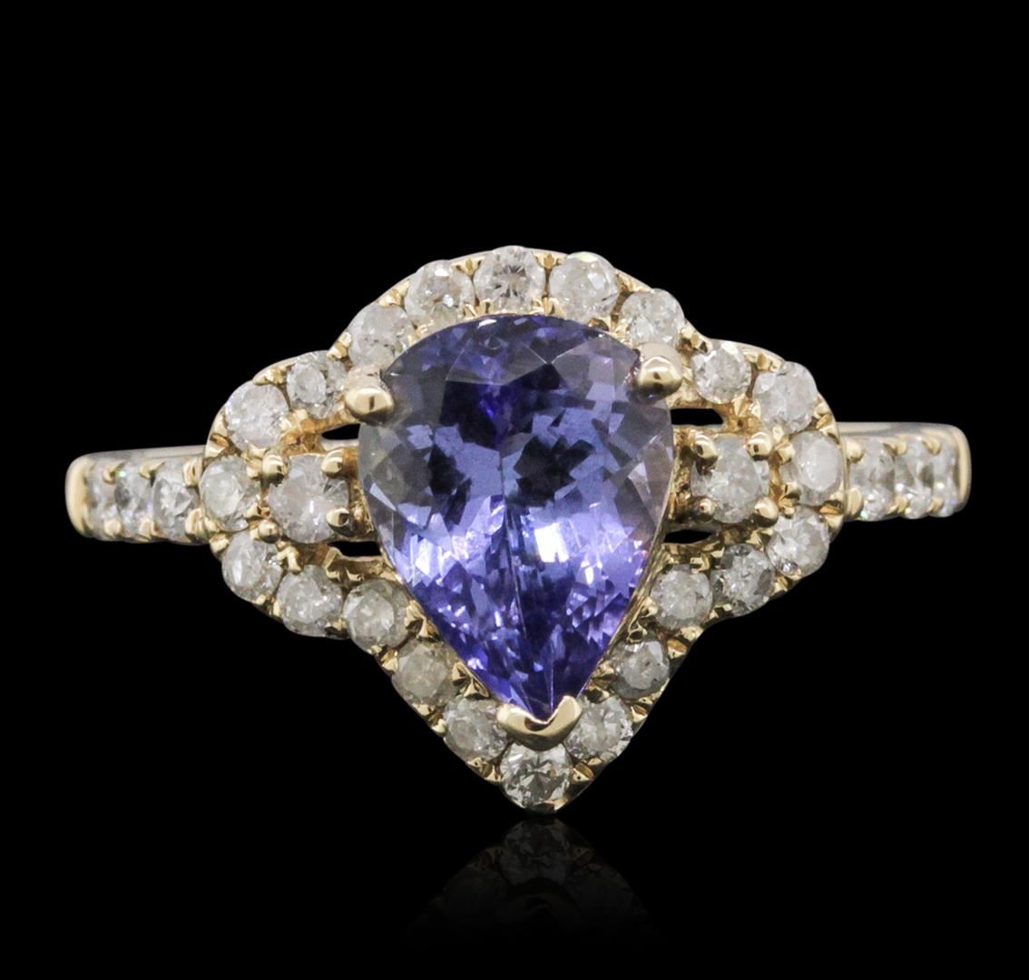 One electronically tested 14KT yellow gold ladies combination cast & assembled tanzanite and diamond ring with a flat shank with a bright polish finish. Identified with markings of "14K". Condition is new. Containing: One prong set pear modified brilliant cut natural tanzanite, measuring 9.00 x 6.91 x 3.46mm, approximate weight of 1.44ct., clarity is eye clean, type I, medium, very slightly grayish, violet color, (GIA V 5/3), cut is good. Thirty prong set round brilliant cut diamonds, measuring 1.90 - 1.50 x 1.02mm (depth est.) approximate total weight of 30 Stones = 0.40ct. Clarity: I-1 to I-2. Color: I - J, Cut is Good. Colored gemstones are presumed to have been subjected to commonly used enhancement processes. All diamonds and colored gemstones are graded in the mounting, unless otherwise stated. Total Weight of Colored Stones 1.44ct. Total Weight of Diamonds 0.40ct. Total Weight of Ring 3.60 grams. GGL Appraised at $4,130.00.