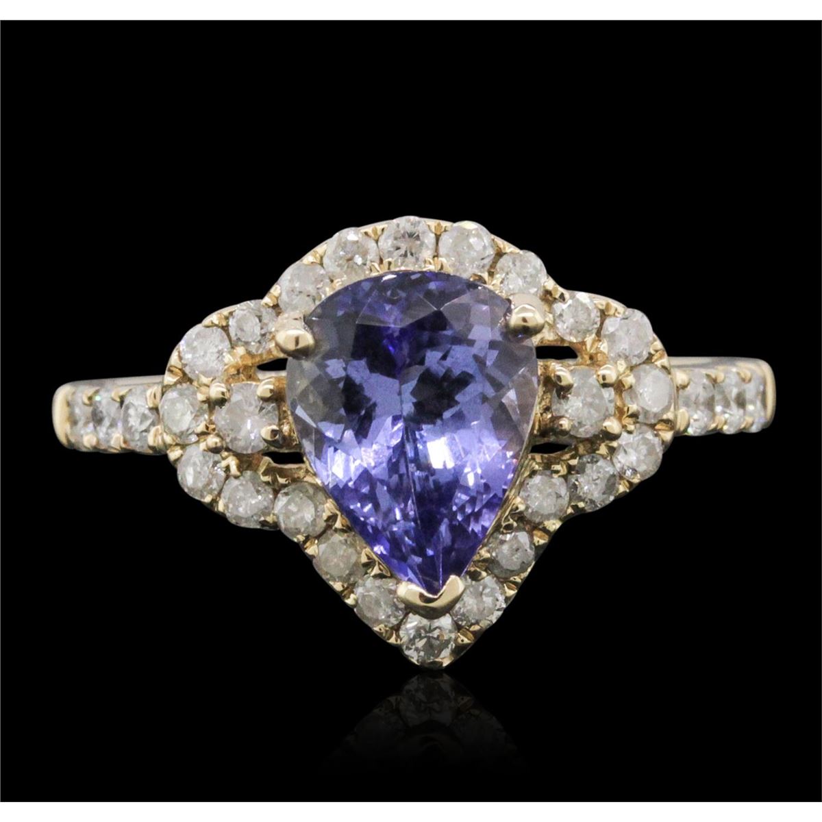 One electronically tested 14KT yellow gold ladies combination cast & assembled tanzanite and diamond ring with a flat shank with a bright polish finish. Identified with markings of "14K". Condition is new. Containing: One prong set pear modified brilliant cut natural tanzanite, measuring 9.00 x 6.91 x 3.46mm, approximate weight of 1.44ct., clarity is eye clean, type I, medium, very slightly grayish, violet color, (GIA V 5/3), cut is good. Thirty prong set round brilliant cut diamonds, measuring 1.90 - 1.50 x 1.02mm (depth est.) approximate total weight of 30 Stones = 0.40ct. Clarity: I-1 to I-2. Color: I - J, Cut is Good. Colored gemstones are presumed to have been subjected to commonly used enhancement processes. All diamonds and colored gemstones are graded in the mounting, unless otherwise stated. Total Weight of Colored Stones 1.44ct. Total Weight of Diamonds 0.40ct. Total Weight of Ring 3.60 grams. GGL Appraised at $4,130.00.