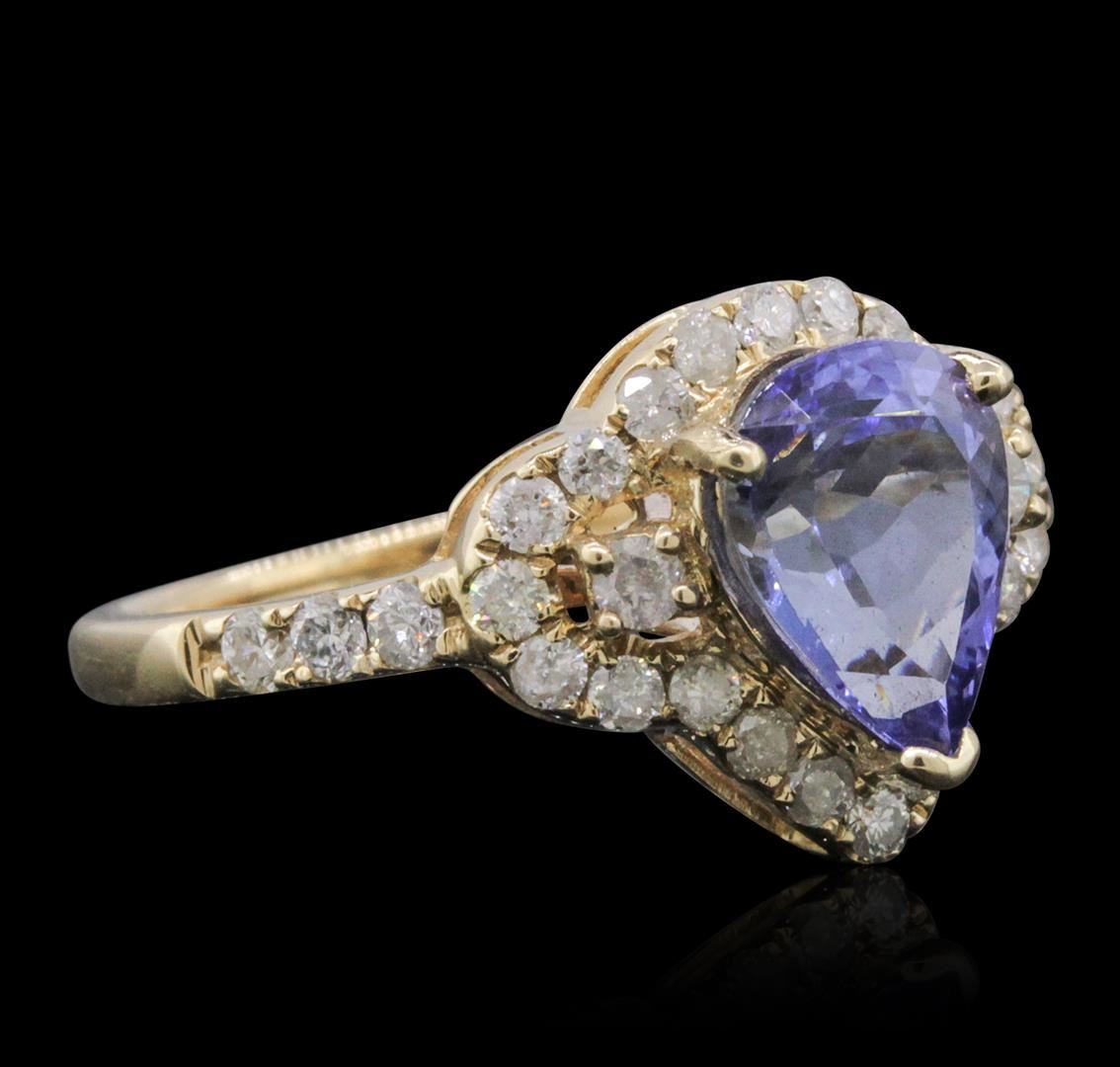 One electronically tested 14KT yellow gold ladies combination cast & assembled tanzanite and diamond ring with a flat shank with a bright polish finish. Identified with markings of "14K". Condition is new. Containing: One prong set pear modified brilliant cut natural tanzanite, measuring 9.00 x 6.91 x 3.46mm, approximate weight of 1.44ct., clarity is eye clean, type I, medium, very slightly grayish, violet color, (GIA V 5/3), cut is good. Thirty prong set round brilliant cut diamonds, measuring 1.90 - 1.50 x 1.02mm (depth est.) approximate total weight of 30 Stones = 0.40ct. Clarity: I-1 to I-2. Color: I - J, Cut is Good. Colored gemstones are presumed to have been subjected to commonly used enhancement processes. All diamonds and colored gemstones are graded in the mounting, unless otherwise stated. Total Weight of Colored Stones 1.44ct. Total Weight of Diamonds 0.40ct. Total Weight of Ring 3.60 grams. GGL Appraised at $4,130.00.