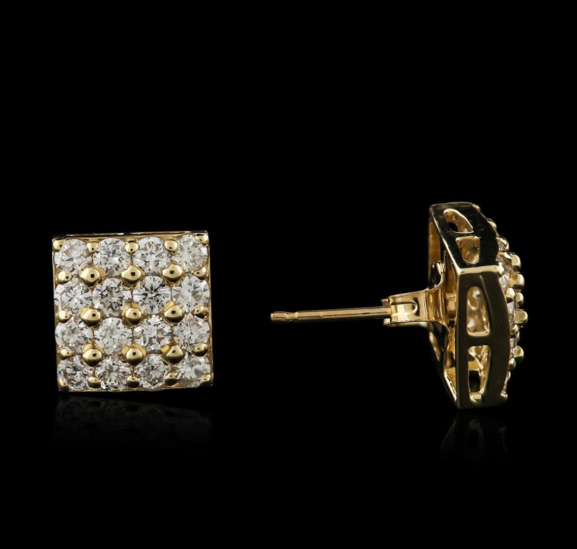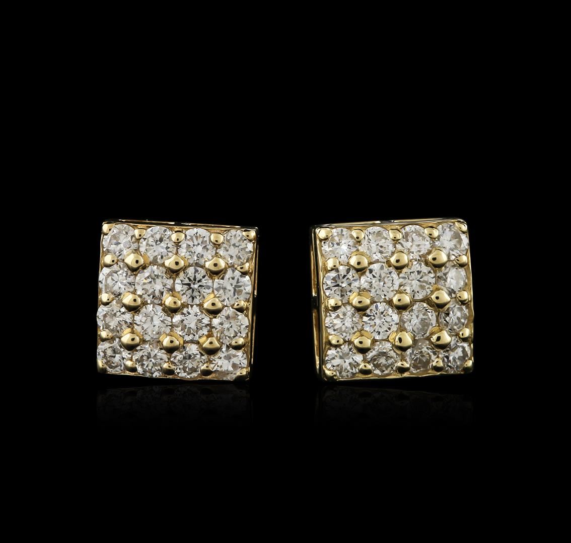 One pair electronically tested 14KT yellow gold ladies cast diamond earrings with friction posts with a bright polish finish. Identified with markings of "585". Condition is new. Containing: Thirty-Two prong set round brilliant cut diamonds, measuring 2.20 - 2.20 x 1.32mm (depth est.) approximate total weight of 32 Stones = 1.46ct. Clarity: SI-2 to I-1. Color: I - J, Cut is Good. Diamonds are graded in the mounting, unless otherwise stated. Total Weight of Diamonds 1.46ct. Total Weight of Earrings 2.90 grams. GGL Appraised at $2,270.00.