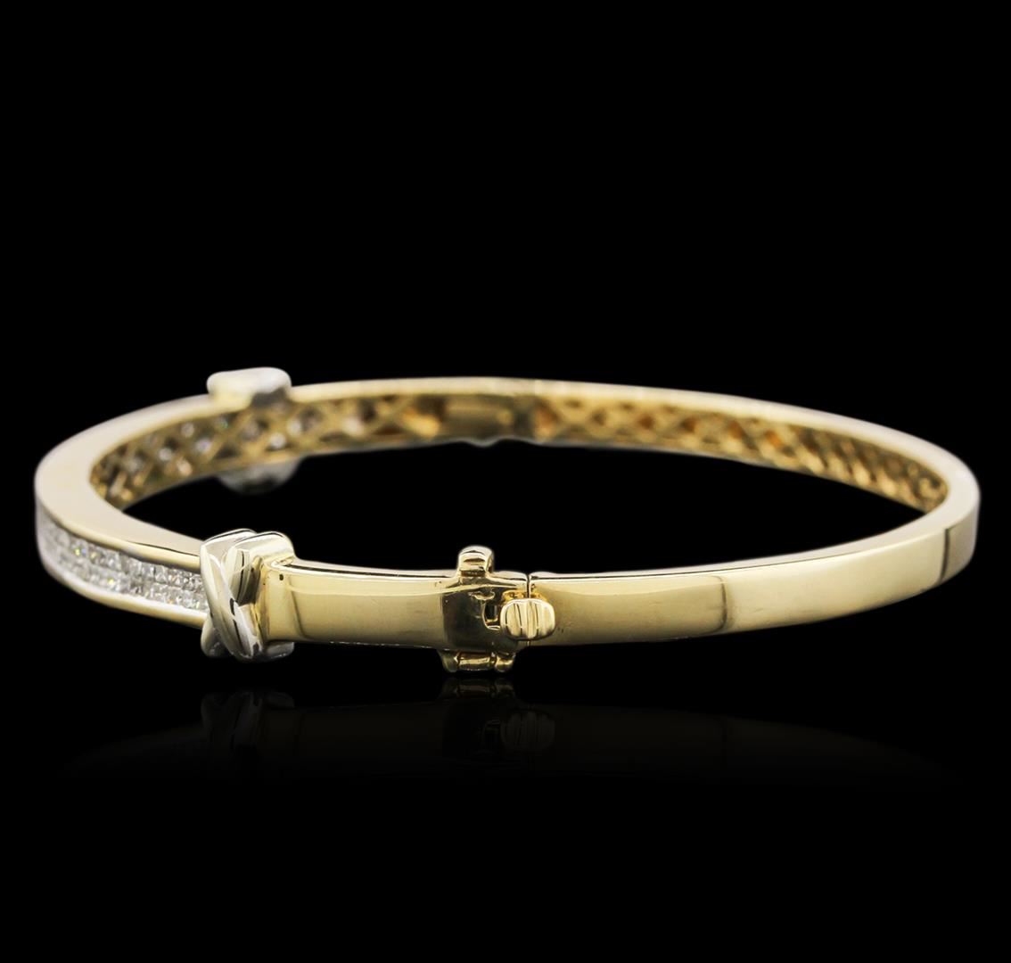 One electronically tested 14KT yellow gold ladies cast diamond bangle bracelet with a hidden box clasp with safety closer with a bright polish finish. Condition is very good. Containing: One Hundred Ten invisible set princess cut diamonds, measuring 1.30 x 1.30 x 0.98mm (depth est.) approximate total weight of 110 Stones = 1.49ct. Clarity: I-1 to I-2. Color: I - J, Cut is Good. All diamonds are graded in the mounting, unless otherwise stated. Total Weight of Diamonds 1.49ct. Total Weight of Bangle Bracelet 17.30 grams. GGL Appraised at $4,685.00.