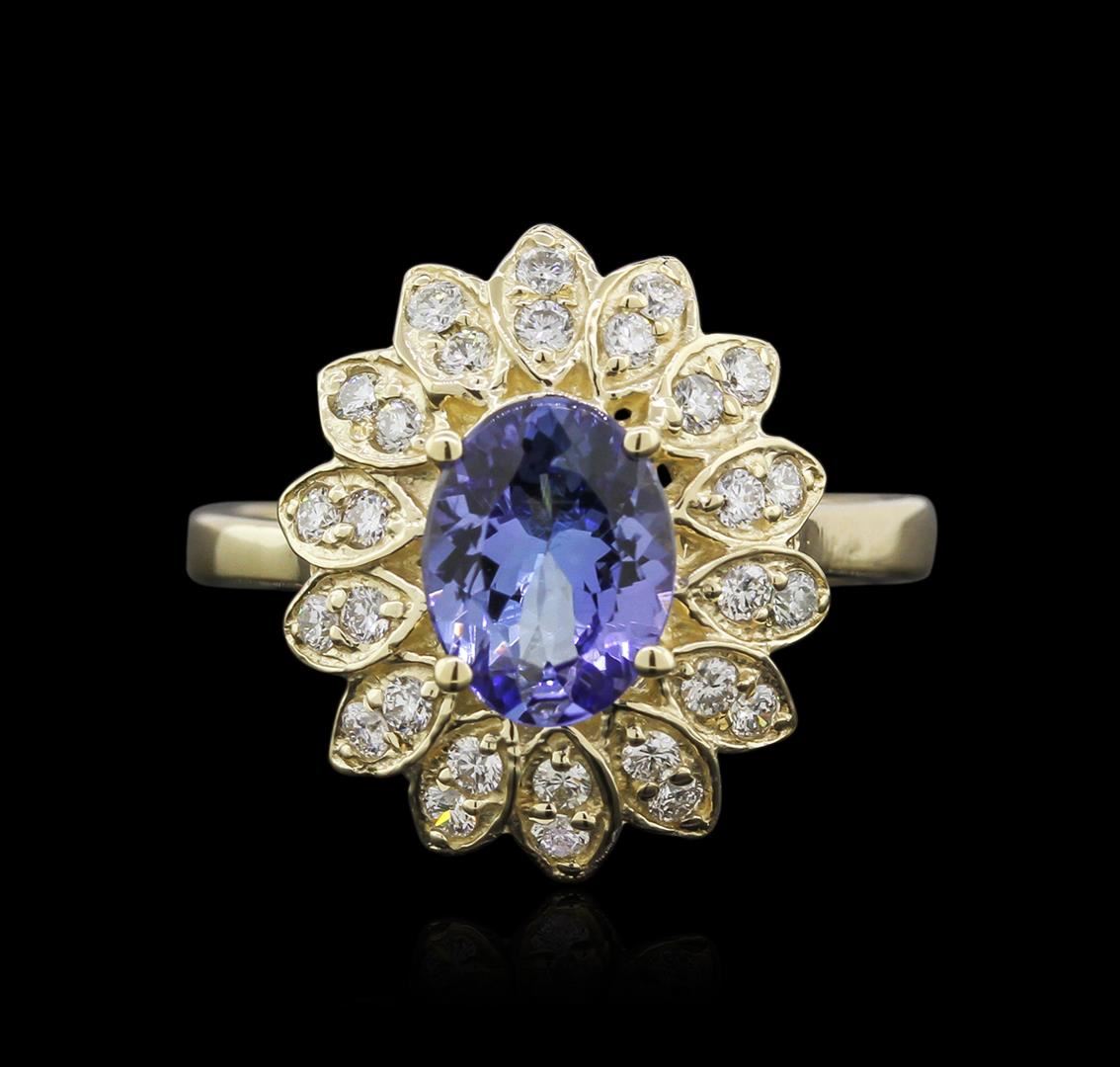 One electronically tested 14KT yellow gold ladies cast tanzanite and diamond ring with a bright polish finish. Condition is new. Containing: One prong set oval modified brilliant cut natural tanzanite, measuring 8.80 x 6.80 x 4.42mm, approximate weight of 1.50ct., clarity is eye clean, type I, medium light, very slightly grayish, violet color, (GIA V 4/3), cut is good. Sixty-Four prong set round brilliant cut diamonds, measuring 1.30 - 1.30 x 0.78mm (depth est.) approximate total weight of 64 Stones = 0.58ct. Clarity: SI-2 to I-1. Color: I - J, Cut is Good. Colored gemstones are presumed to have been subjected to commonly used enhancement processes. All diamonds and colored gemstones are graded in the mounting, unless otherwise stated. Total Weight of Colored Stones 1.50ct. Total Weight of Diamonds 0.58ct. Total Weight of Ring 4.90 grams. GGL Appraised at $2,705.00.