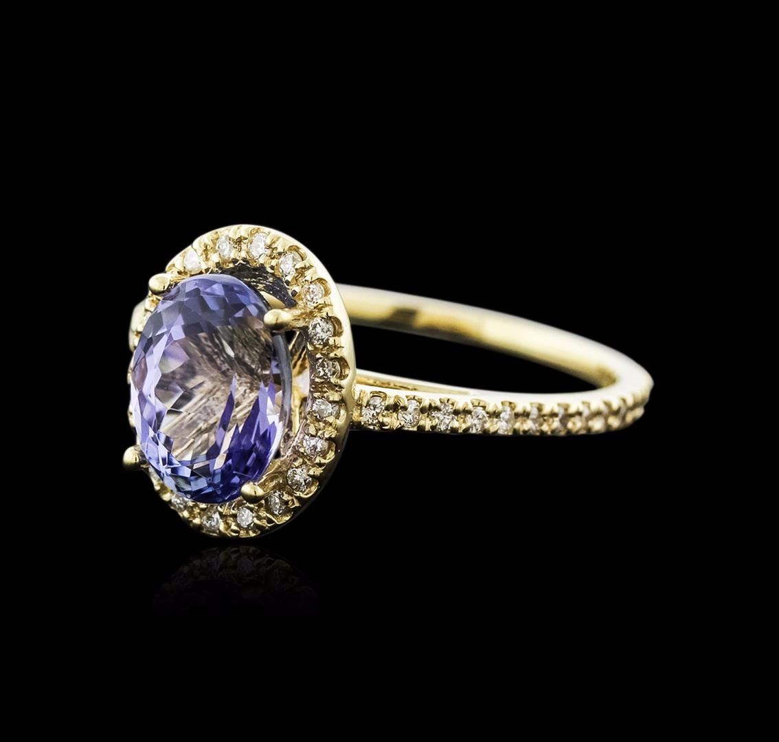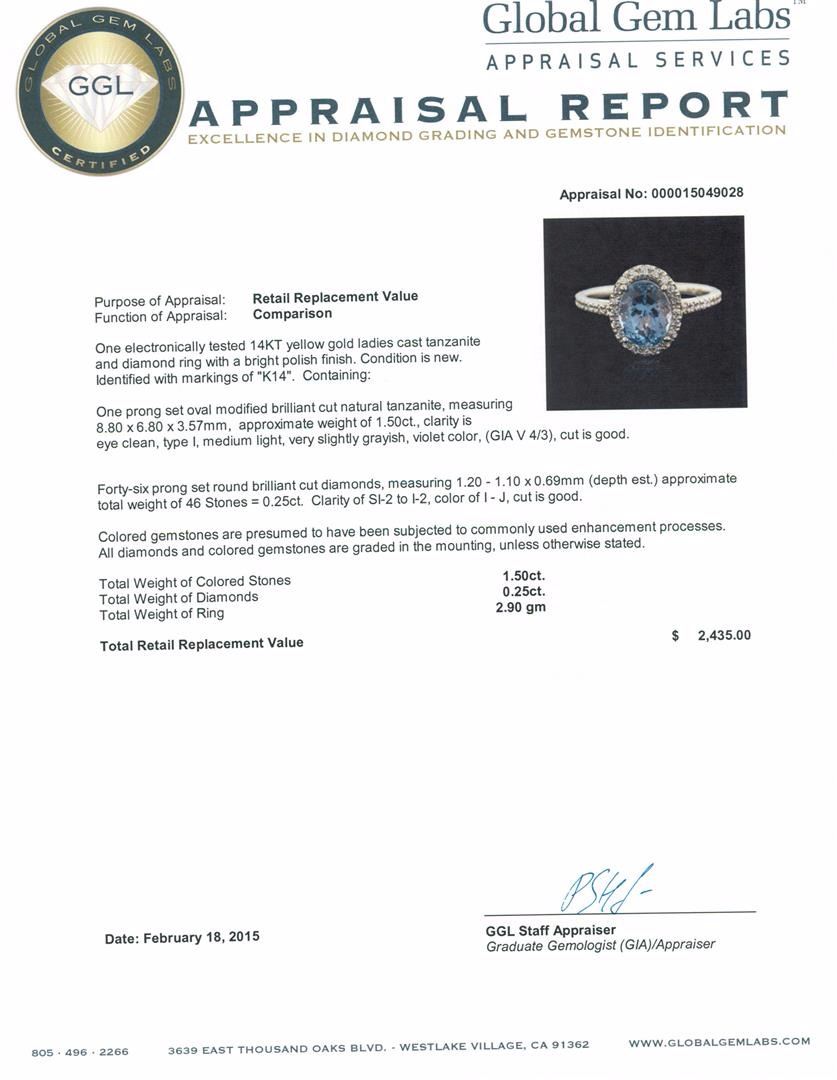 One electronically tested 14KT yellow gold ladies cast tanzanite and diamond ring with a bright polish finish. Identified with markings of "K14". Condition is new. Containing: One prong set oval modified brilliant cut natural tanzanite, measuring 8.80 x 6.80 x 3.57mm, approximate weight of 1.50ct., clarity is eye clean, type I, medium light, very slightly grayish, violet color, (GIA V 4/3), cut is good. Forty-Six prong set round brilliant cut diamonds, measuring 1.20 - 1.10 x 0.69mm (depth est.) approximate total weight of 46 Stones = 0.25ct. Clarity: SI-2 to I-2. Color: I - J, Cut is Good. Colored gemstones are presumed to have been subjected to commonly used enhancement processes. All diamonds and colored gemstones are graded in the mounting, unless otherwise stated. Total Weight of Colored Stones 1.50ct. Total Weight of Diamonds 0.25ct. Total Weight of Ring 2.90 grams. GGL Appraised at $2,435.00.