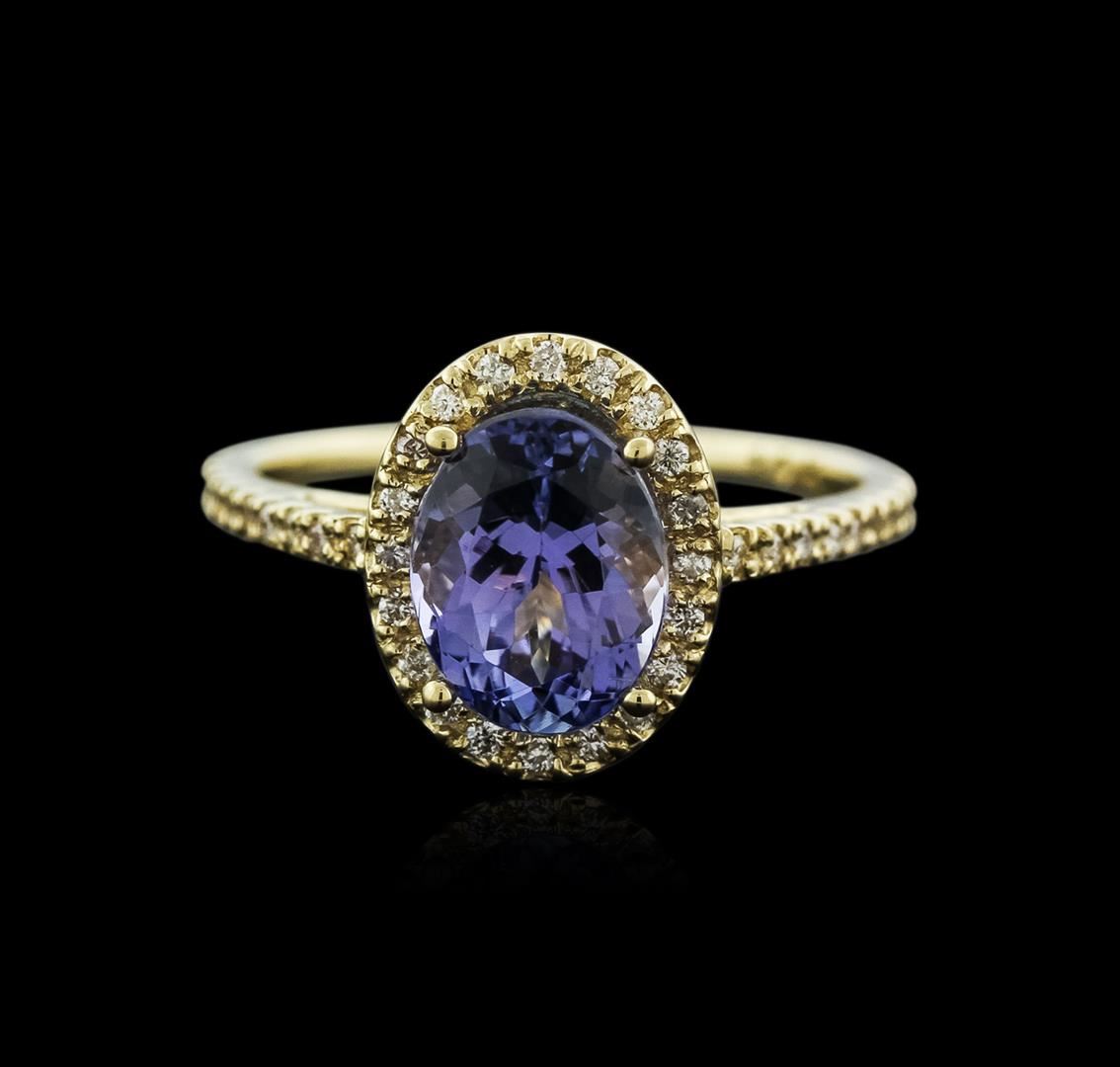 One electronically tested 14KT yellow gold ladies cast tanzanite and diamond ring with a bright polish finish. Identified with markings of "K14". Condition is new. Containing: One prong set oval modified brilliant cut natural tanzanite, measuring 8.80 x 6.80 x 3.57mm, approximate weight of 1.50ct., clarity is eye clean, type I, medium light, very slightly grayish, violet color, (GIA V 4/3), cut is good. Forty-Six prong set round brilliant cut diamonds, measuring 1.20 - 1.10 x 0.69mm (depth est.) approximate total weight of 46 Stones = 0.25ct. Clarity: SI-2 to I-2. Color: I - J, Cut is Good. Colored gemstones are presumed to have been subjected to commonly used enhancement processes. All diamonds and colored gemstones are graded in the mounting, unless otherwise stated. Total Weight of Colored Stones 1.50ct. Total Weight of Diamonds 0.25ct. Total Weight of Ring 2.90 grams. GGL Appraised at $2,435.00.