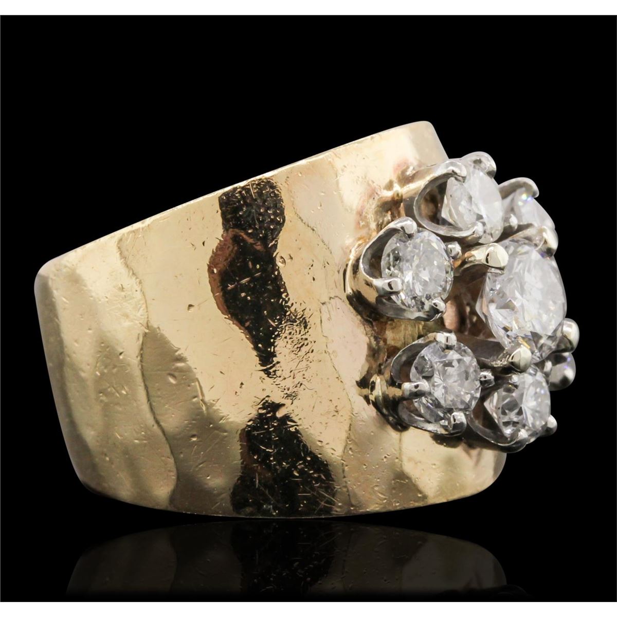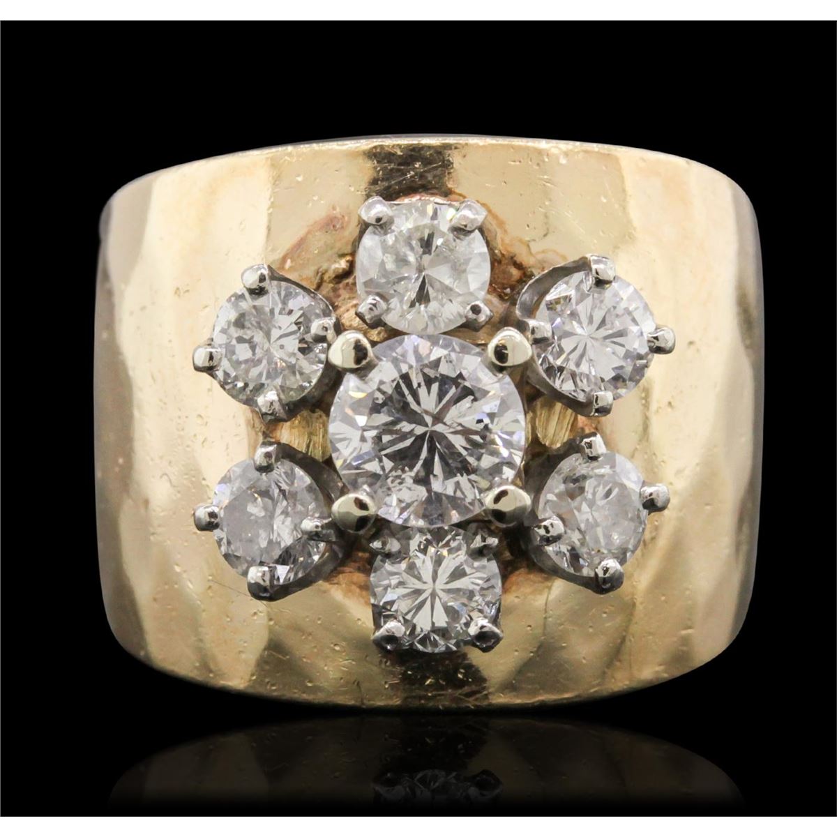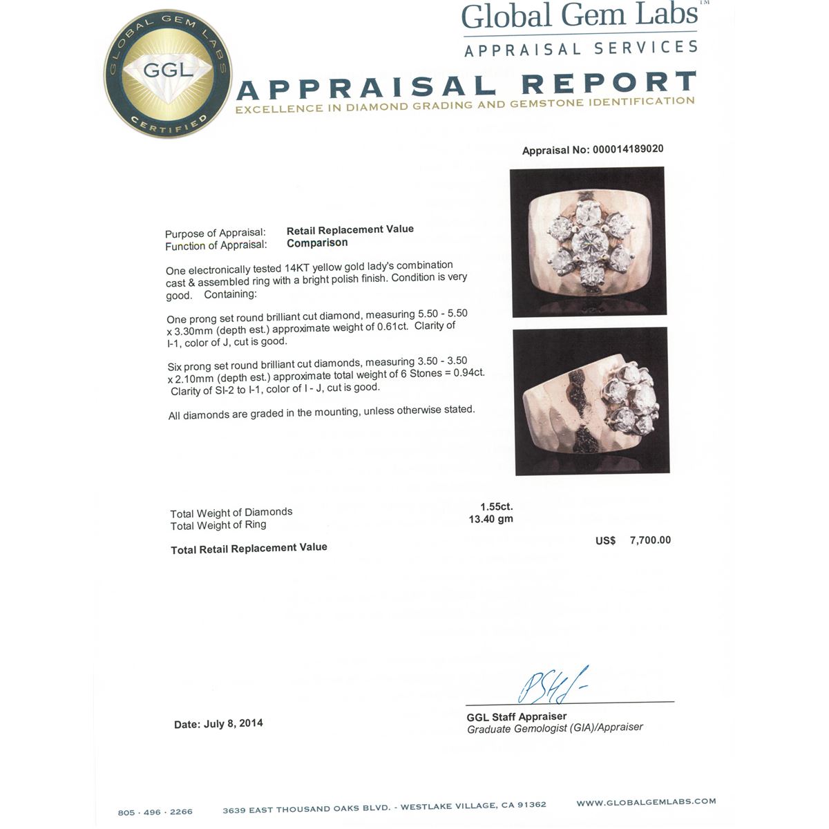 One electronically tested 14KT yellow gold Ladies combination cast & assembled ring with a bright polish finish. Condition is very good. Containing: One prong set round brilliant cut diamond, measuring 5.50 - 5.50 x 3.30mm (depth est.) approximate weight of 0.61ct. Clarity: I-1. Color: J, Cut is Good. Six prong set round brilliant cut diamonds, measuring 3.50 - 3.50 x 2.10mm (depth est.) approximate. Total Weight of 6 Stones = 0.94ct. Clarity: SI-2 to I-1. Color: I - J, Cut is Good. All diamonds are graded in the mounting, unless otherwise stated. Total Weight of Diamonds 1.55ct. Total Weight of Ring 13.40 grams. GGL Appraised at $7,700.00.