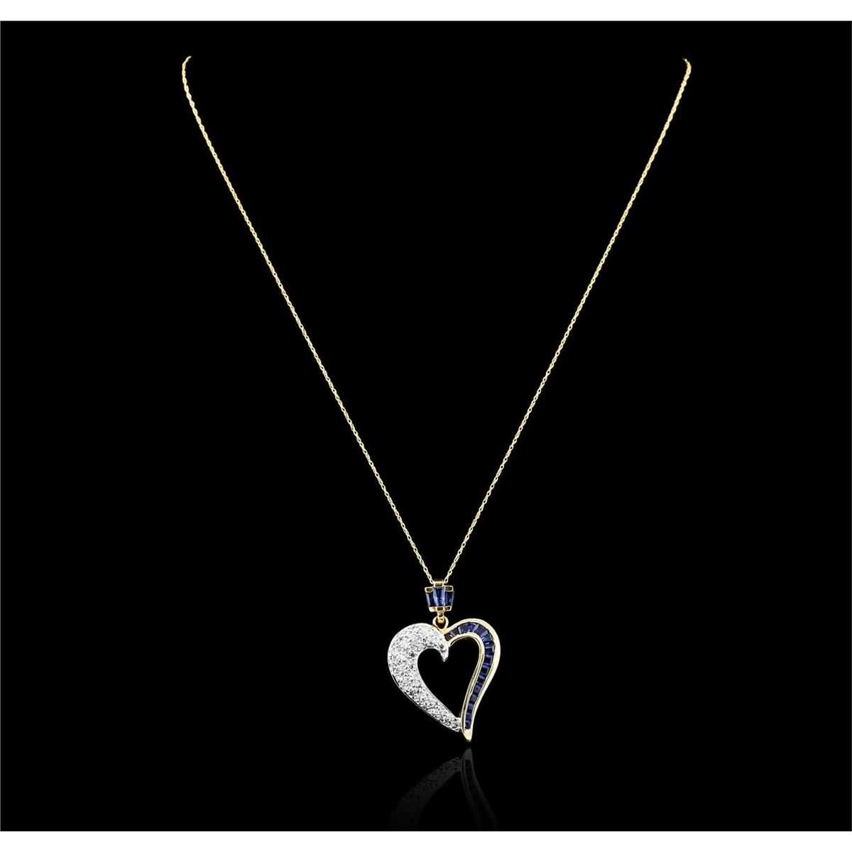 One heart shape pendant with chain featuring: 14KT yellow gold weighing 8.00 grams containing sapphires with a total weight of 1.56cts and round diamonds with a total weight of 0.38cts.