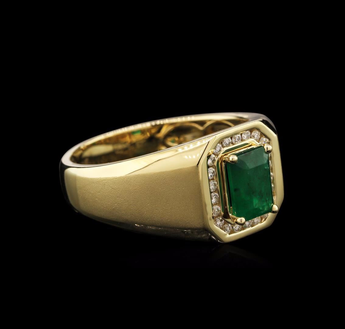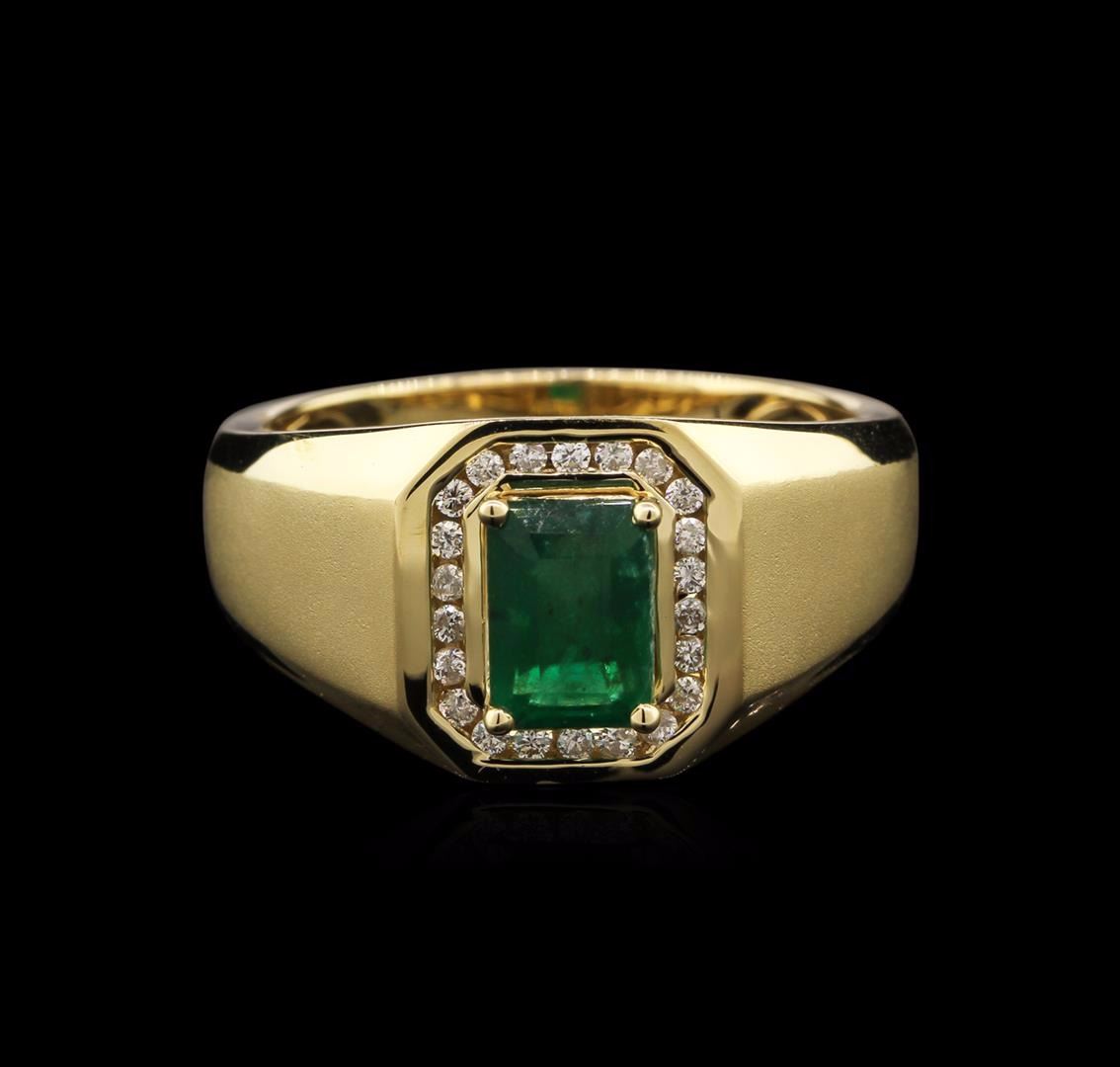 One ring featuring: 14KT yellow gold weighing 7.76 grams containing one emerald center stone with a total weight of 1.57ct and 22 round diamonds with a total weight of 0.21ct.