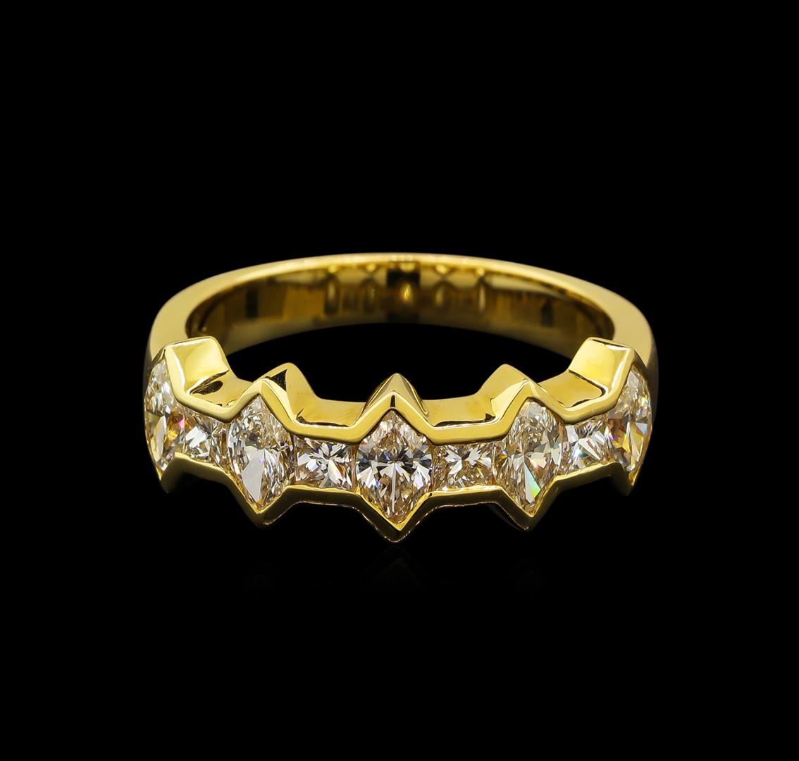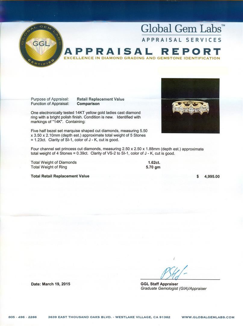One electronically tested 14KT yellow gold ladies cast diamond ring with a bright polish finish. Identified with markings of "14K". Condition is new. Containing: Five half bezel set marquise shaped cut diamonds, measuring 5.50 x 3.50 x 2.21mm (depth est.) approximate total weight of 5 Stones = 1.23ct. Clarity: SI-1. Color: J - K, Cut is Good. Four channel set princess cut diamonds, measuring 2.50 x 2.50 x 1.88mm (depth est.) approximate total weight of 4 Stones = 0.39ct. Clarity: VS-2 to SI-1. Color: J - K, Cut is Good. All diamonds are graded in the mounting, unless otherwise stated. Total Weight of Diamonds 1.62ct. Total Weight of Ring 5.70 grams. GGL Appraised at $4,995.00.