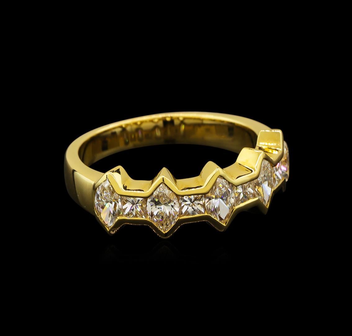 One electronically tested 14KT yellow gold ladies cast diamond ring with a bright polish finish. Identified with markings of "14K". Condition is new. Containing: Five half bezel set marquise shaped cut diamonds, measuring 5.50 x 3.50 x 2.21mm (depth est.) approximate total weight of 5 Stones = 1.23ct. Clarity: SI-1. Color: J - K, Cut is Good. Four channel set princess cut diamonds, measuring 2.50 x 2.50 x 1.88mm (depth est.) approximate total weight of 4 Stones = 0.39ct. Clarity: VS-2 to SI-1. Color: J - K, Cut is Good. All diamonds are graded in the mounting, unless otherwise stated. Total Weight of Diamonds 1.62ct. Total Weight of Ring 5.70 grams. GGL Appraised at $4,995.00.