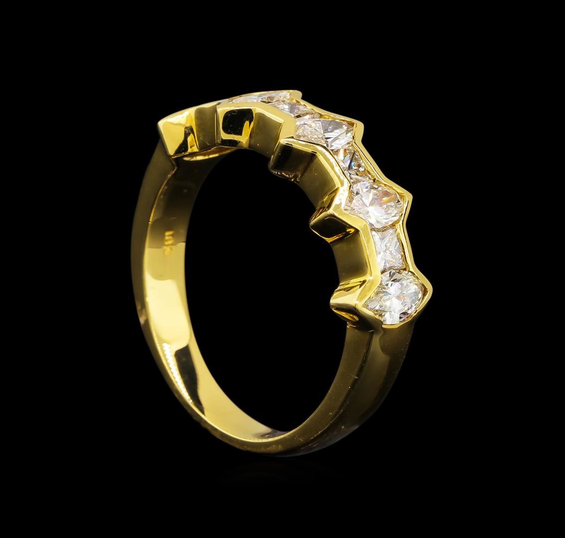 One electronically tested 14KT yellow gold ladies cast diamond ring with a bright polish finish. Identified with markings of "14K". Condition is new. Containing: Five half bezel set marquise shaped cut diamonds, measuring 5.50 x 3.50 x 2.21mm (depth est.) approximate total weight of 5 Stones = 1.23ct. Clarity: SI-1. Color: J - K, Cut is Good. Four channel set princess cut diamonds, measuring 2.50 x 2.50 x 1.88mm (depth est.) approximate total weight of 4 Stones = 0.39ct. Clarity: VS-2 to SI-1. Color: J - K, Cut is Good. All diamonds are graded in the mounting, unless otherwise stated. Total Weight of Diamonds 1.62ct. Total Weight of Ring 5.70 grams. GGL Appraised at $4,995.00.