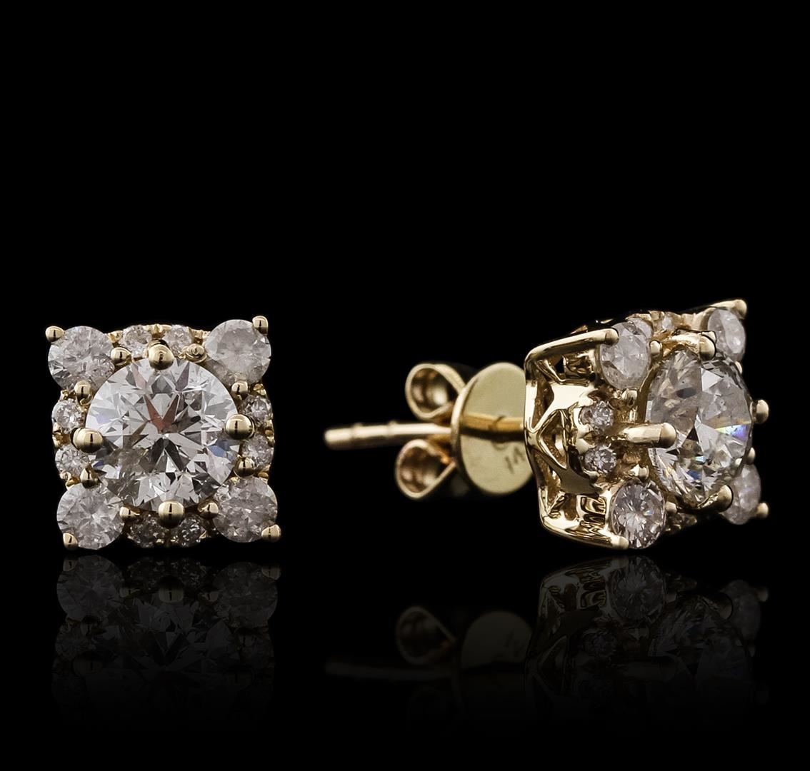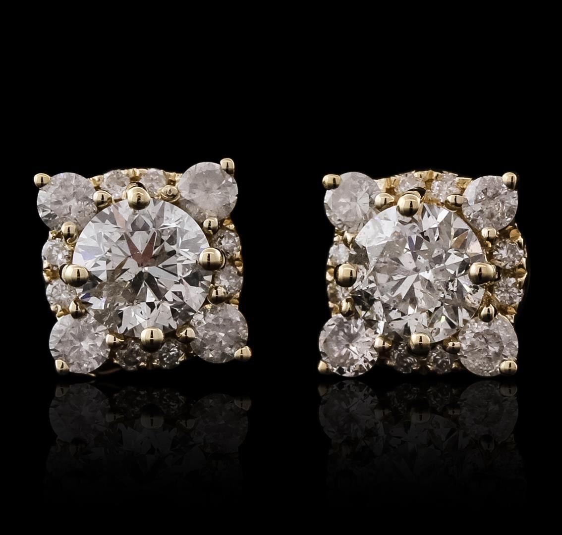 One pair electronically tested 14KT yellow gold ladies cast & assembled diamond earrings with standard backs. Bright polish good. Trademark is Orianne. Identified with markings of "14K". Condition is new, good workmanship. Containing: Two prong set round brilliant cut diamonds, measuring 5.10 - 5.00 x 3.03mm (depth est.) approximate total weight of 2 Stones = 1.04ct. Graded in the setting. Clarity: I-1. Color: J Eight prong set round brilliant cut diamonds, measuring 2.30 - 2.20 x 1.35mm (depth est.) approximate total weight of 8 Stones = 0.43ct. Graded in the setting. Clarity: I-1 to I-2. Color: I - K Sixteen prong set round brilliant cut diamonds, measuring 1.20 - 1.10 x 0.69mm (depth est.) approximate total weight of 16 Stones = 0.15ct. Graded in the setting. Clarity: I-1 to I-2. Color: H - J. Total Weight of Diamonds 1.62ct. Total Weight of Earrings 2.40gm. AIG Appraised at $7,705.00.