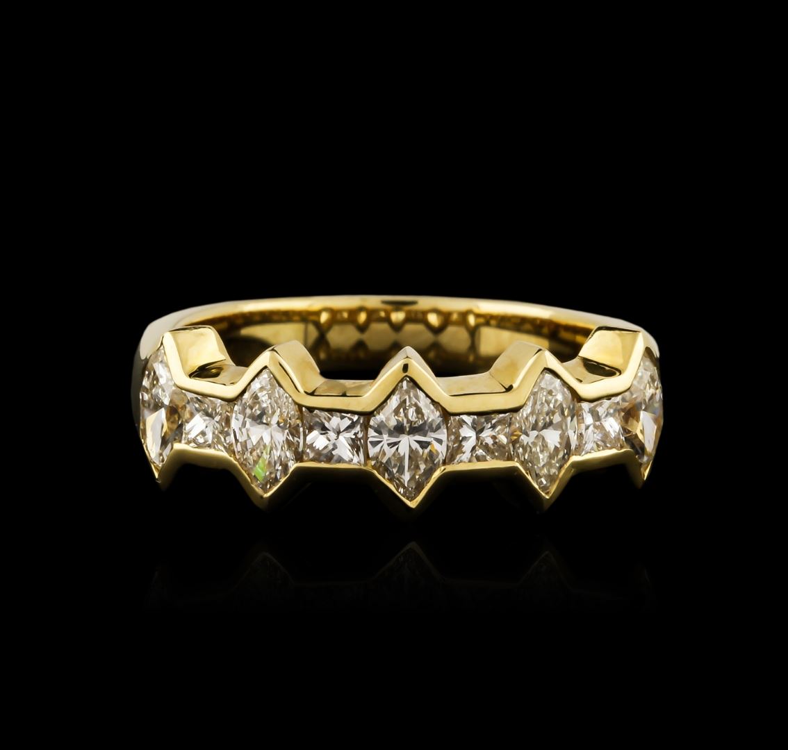 One electronically tested 14KT yellow gold ladies cast diamond ring with a bright polish finish. Identified with markings of "14K". Condition is new. Containing: Five half bezel set marquise shaped cut diamonds, measuring 5.50 x 3.50 x 2.21mm (depth est.) approximate total weight of 5 Stones = 1.23ct. Clarity: SI-1. Color: J - K, Cut is Good. Four channel set princess cut diamonds, measuring 2.50 x 2.50 x 1.88mm (depth est.) approximate total weight of 4 Stones = 0.39ct. Clarity: VS-2 to SI-1. Color: J - K, Cut is Good. All diamonds are graded in the mounting, unless otherwise stated. Total Weight of Diamonds 1.62ct. Total Weight of Ring 5.70 grams. GGL Appraised at $4,995.00.