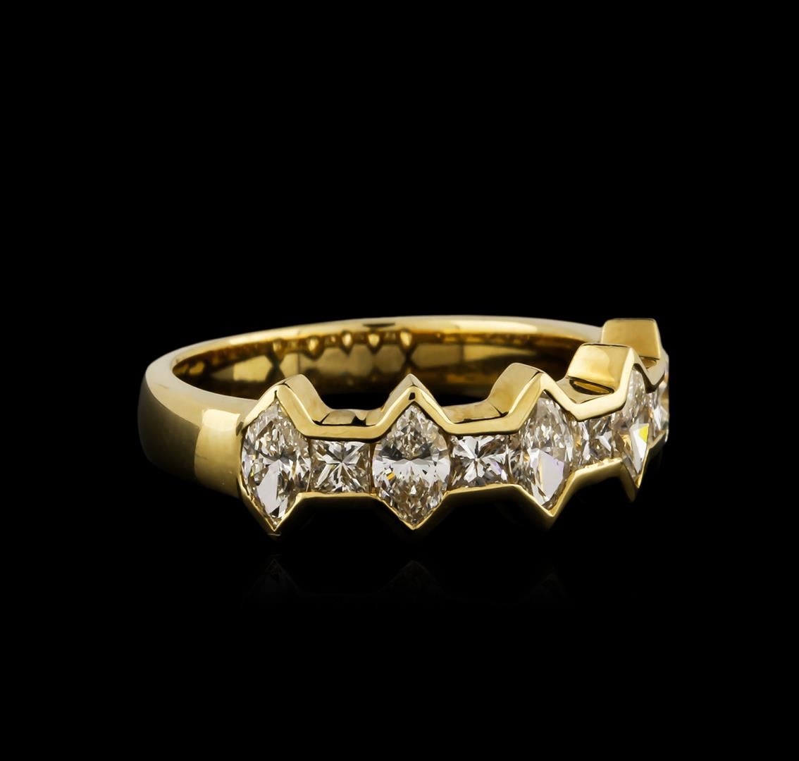 One electronically tested 14KT yellow gold ladies cast diamond ring with a bright polish finish. Identified with markings of "14K". Condition is new. Containing: Five half bezel set marquise shaped cut diamonds, measuring 5.50 x 3.50 x 2.21mm (depth est.) approximate total weight of 5 Stones = 1.23ct. Clarity: SI-1. Color: J - K, Cut is Good. Four channel set princess cut diamonds, measuring 2.50 x 2.50 x 1.88mm (depth est.) approximate total weight of 4 Stones = 0.39ct. Clarity: VS-2 to SI-1. Color: J - K, Cut is Good. All diamonds are graded in the mounting, unless otherwise stated. Total Weight of Diamonds 1.62ct. Total Weight of Ring 5.70 grams. GGL Appraised at $4,995.00.
