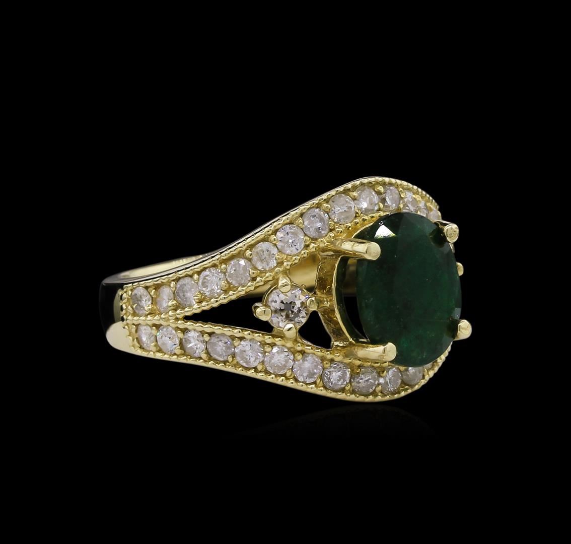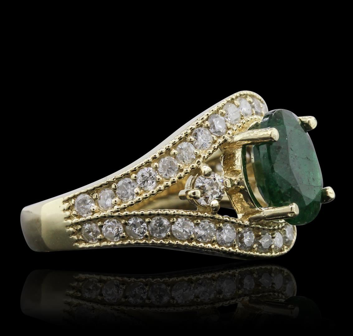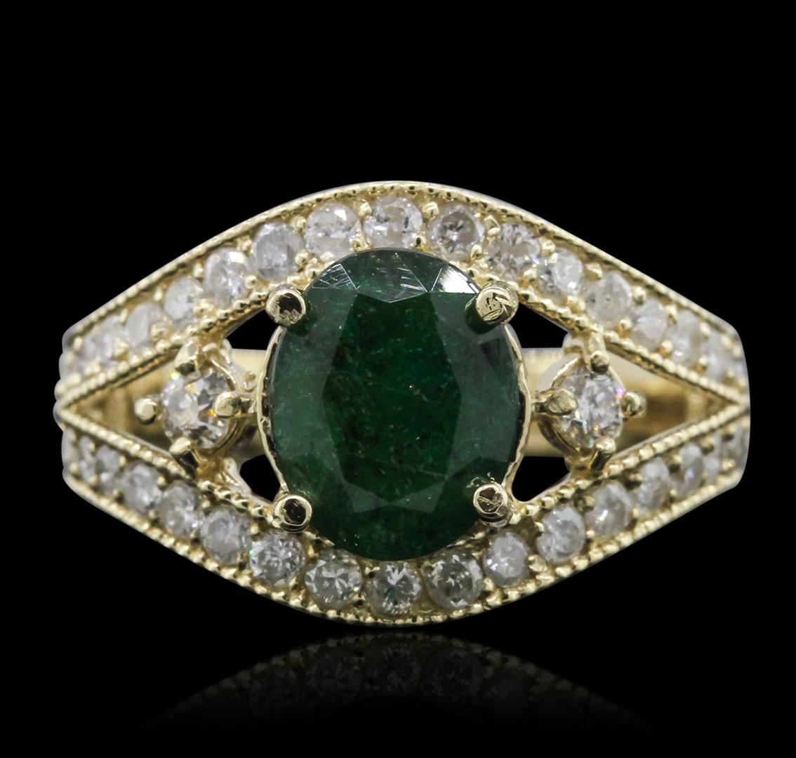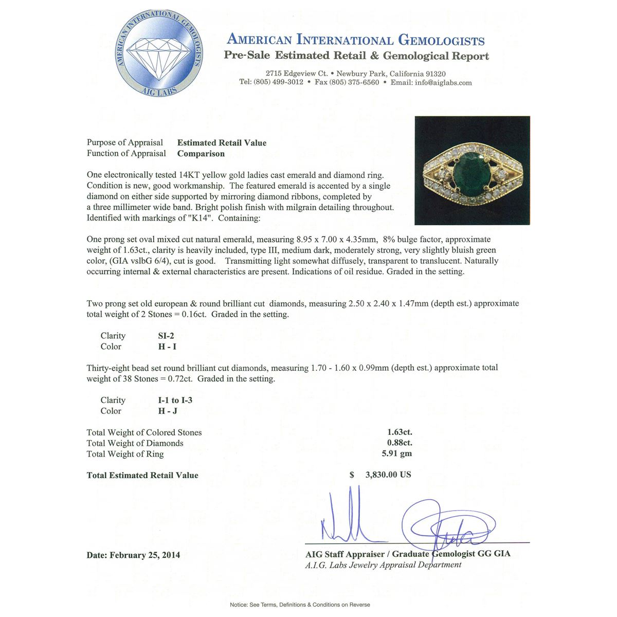 One electronically tested 14KT yellow gold ladies cast emerald and diamond ring. Condition is new, good workmanship. The featured emerald is accented by a single diamond on either side supported by mirroring diamond ribbons, completed by a three millimeter wide band. Bright polish finish with milgrain detailing throughout. Identified with markings of "K14". Containing: One prong set oval mixed cut natural emerald, measuring 8.95 x 7.00 x 4.35mm, 8% bulge factor, approximate weight of 1.63ct, clarity is heavily included, type III, medium dark, moderately strong, very slightly bluish green color, (GIA vslbG 6/4), cut is good. Transmitting light somewhat diffusely, transparent to translucent. Naturally occurring internal & external characteristics are present. Indications of oil residue. Graded in the setting. Two prong set old European & round brilliant cut diamonds, measuring 2.50 x 2.40 x 1.47mm (depth est.) approximate total weight of 2 Stones = 0.16ct. Graded in the setting. Clarity SI-2 Color H - I Thirty-Eight bead set round brilliant cut diamonds, measuring 1.70 - 1.60 x 0.99mm (depth est.) approximate total weight of 38 Stones = 0.72ct. Graded in the setting. Clarity I-1 to I-3 Color H - J Total Weight of Colored Stones 1.63ct. Total Weight of Diamonds 0.88ct. Total Weight of Ring 5.91 grams. AIG Appraised at $3,830.00.