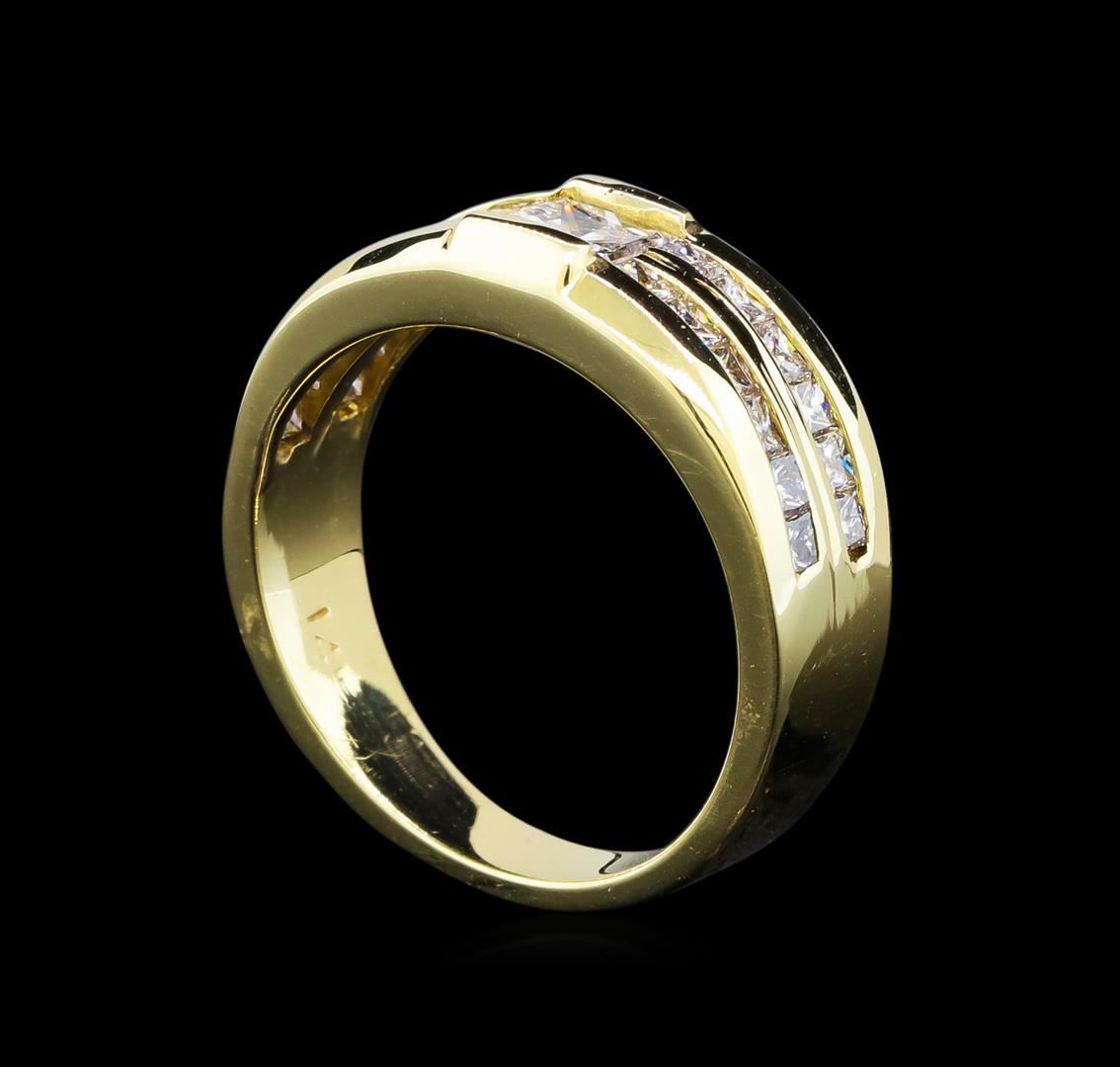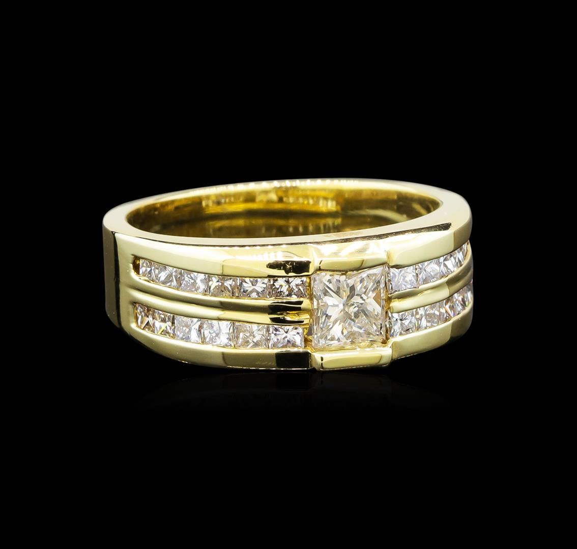One electronically tested 14KT yellow gold ladies cast diamond engagement ring with a bright polish finish. Identified with markings of "14K". Condition is very good. Containing: One prong set princess cut diamond, measuring 4.20 x 4.20 x 3.15mm (depth est.) approximate weight of 0.46ct. Clarity: SI-2. Color: J. Twenty-Four channel set princess cut diamonds, measuring 2.00 x 2.00 x 1.50mm (depth est.) approximate total weight of 24 Stones = 1.18ct. Clarity: SI-1 to SI-2. Color: J. All diamonds are graded in the mounting, unless otherwise stated. Total Weight of Diamonds 1.64ct. Total Weight of Engagement Ring 6.00 grams. GGL Appraised at $3,600.00.