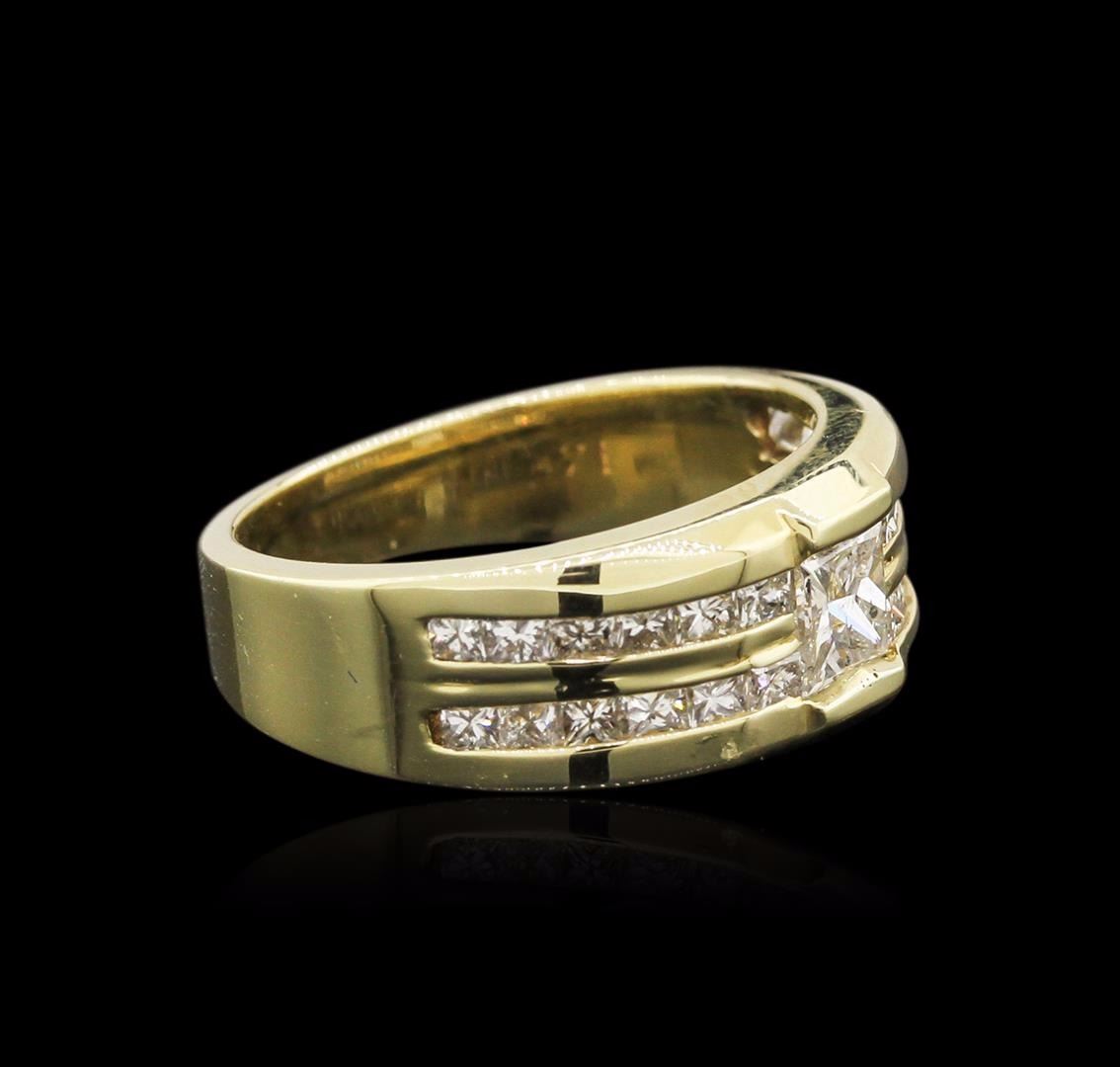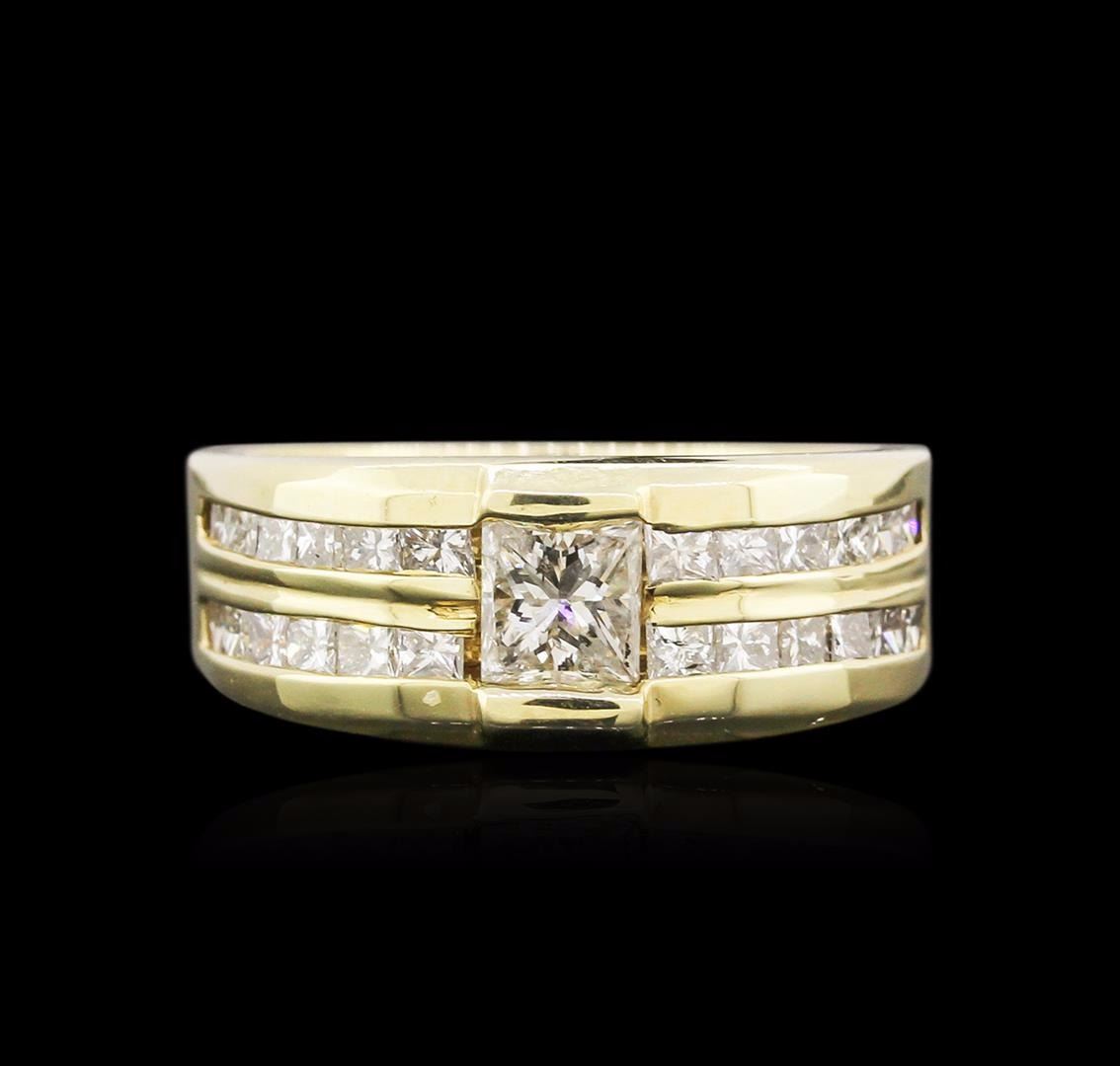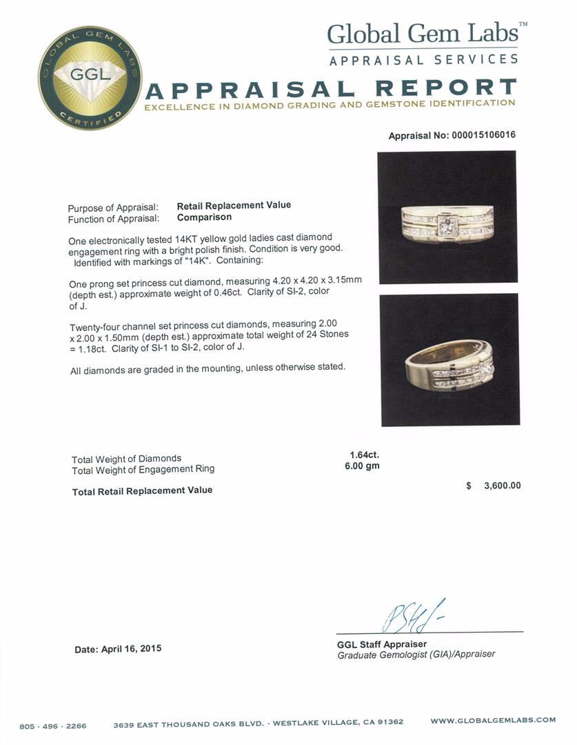 One electronically tested 14KT yellow gold ladies cast diamond engagement ring with a bright polish finish. Identified with markings of "14K". Condition is very good. Containing: One prong set princess cut diamond, measuring 4.20 x 4.20 x 3.15mm (depth est.) approximate weight of 0.46ct. Clarity: SI-2. Color: J. Twenty-Four channel set princess cut diamonds, measuring 2.00 x 2.00 x 1.50mm (depth est.) approximate total weight of 24 Stones = 1.18ct. Clarity: SI-1 to SI-2. Color: J. All diamonds are graded in the mounting, unless otherwise stated. Total Weight of Diamonds 1.64ct. Total Weight of Engagement Ring 6.00 grams. GGL Appraised at $3,600.00.