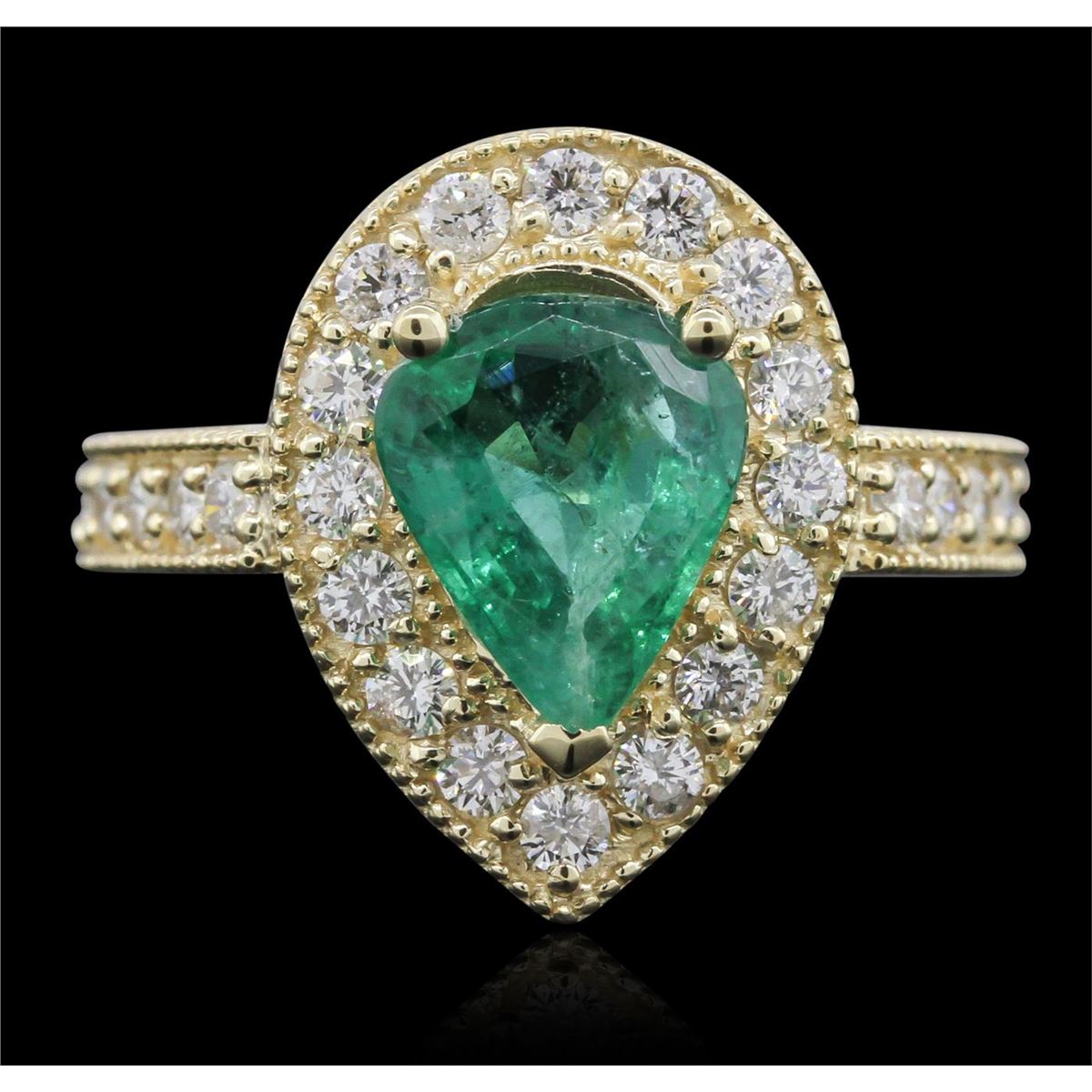 Great Condition! One electronically tested 14KT yellow gold Ladies combination cast & assembled fashion ring with a bright polish finish. Condition is new. Identified with markings of "14K". Containing: One prong set pear modified brilliant cut natural emerald, measuring 9.70 x 7.80 x 4.00mm, approximate weight of 1.65ct., clarity is moderately included, type III, medium light, moderately strong, very slightly bluish green color, (GIA vslbG 4/4), cut is good. Colored gemstones are presumed to have been subjected to commonly used and possible undetectable color/clarity enhancement processes. Twenty-Eight bead set round brilliant cut diamonds, measuring 1.90 - 1.90 x 1.14mm (depth est.) approximate total weight of 28 Stones = 0.70ct. Clarity of I-1 to I-2, Color of I - J, Cut is Good. Total Weight of Colored Stones 1.65ct. Total Weight of Diamonds 0.70ct. Total Weight of Ring 5.80 grams. GGL Appraised at $6,445.00.