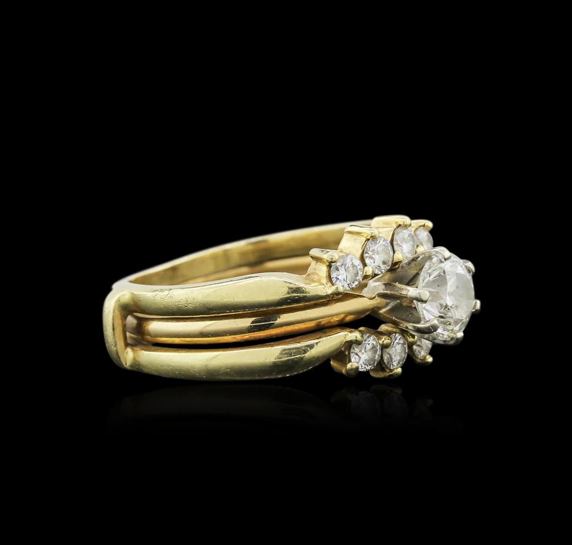 One electronically tested 14KT yellow gold ladies cast diamond engagement ring & guard with a bright polish finish. Identified with markings of "14K". Condition is good. Containing: One prong set round brilliant cut diamond, measuring 6.50 - 6.50 x 3.90mm (depth est.) approximate weight of 1.01ct. Clarity: I-2. Color: K, Cut is Good. Eight prong set round brilliant cut diamonds, measuring 2.80 - 2.80 x 1.68mm (depth est.) approximate total weight of 8 Stones = 0.64ct. Clarity: VS-2 to SI-1. Color: I - J, Cut is Good. All diamonds are graded in the mounting, unless otherwise stated. Total Weight of Diamonds 1.65ct. Total Weight of Engagement Ring & Guard 9.10 grams. GGL Appraised at $6,600.00.