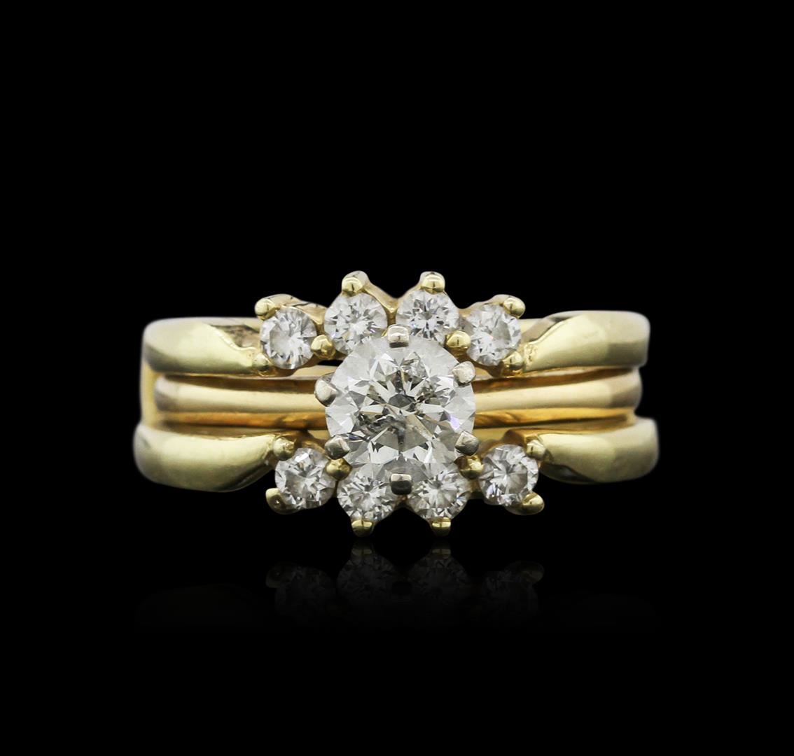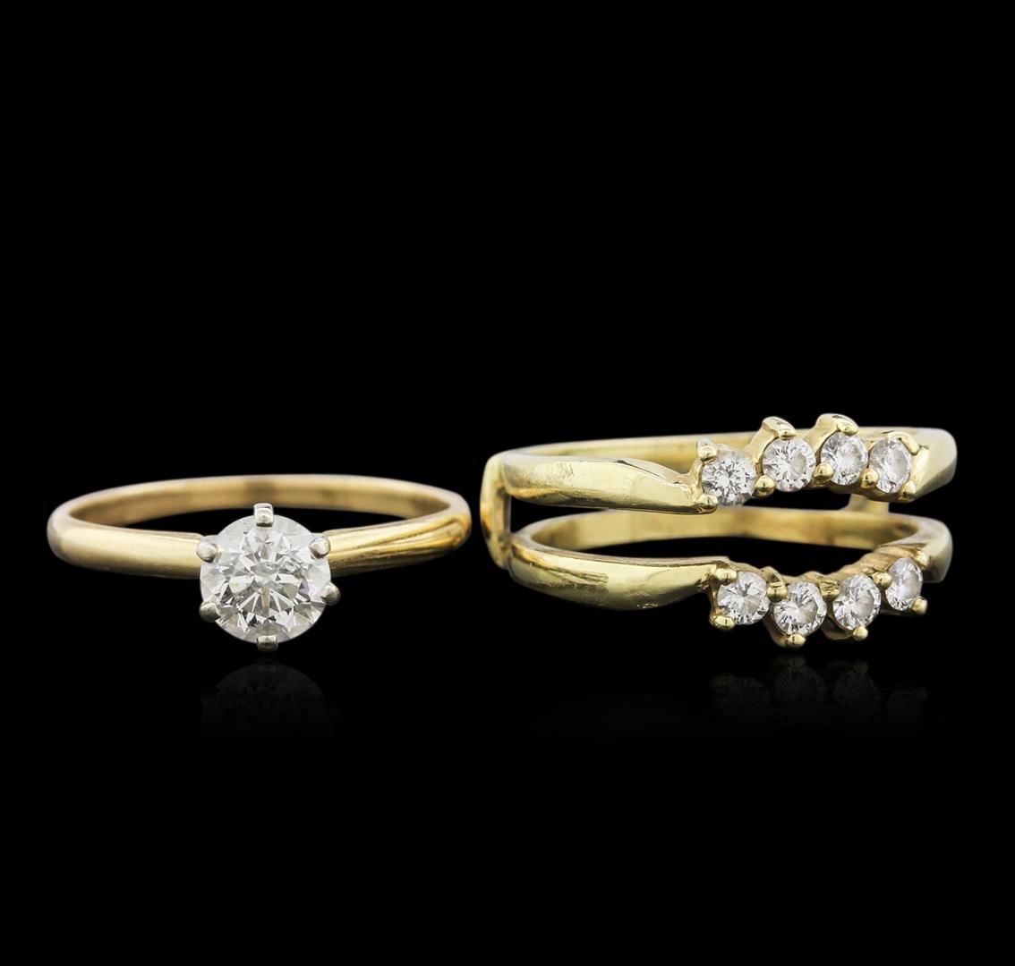 One electronically tested 14KT yellow gold ladies cast diamond engagement ring & guard with a bright polish finish. Identified with markings of "14K". Condition is good. Containing: One prong set round brilliant cut diamond, measuring 6.50 - 6.50 x 3.90mm (depth est.) approximate weight of 1.01ct. Clarity: I-2. Color: K, Cut is Good. Eight prong set round brilliant cut diamonds, measuring 2.80 - 2.80 x 1.68mm (depth est.) approximate total weight of 8 Stones = 0.64ct. Clarity: VS-2 to SI-1. Color: I - J, Cut is Good. All diamonds are graded in the mounting, unless otherwise stated. Total Weight of Diamonds 1.65ct. Total Weight of Engagement Ring & Guard 9.10 grams. GGL Appraised at $6,600.00.