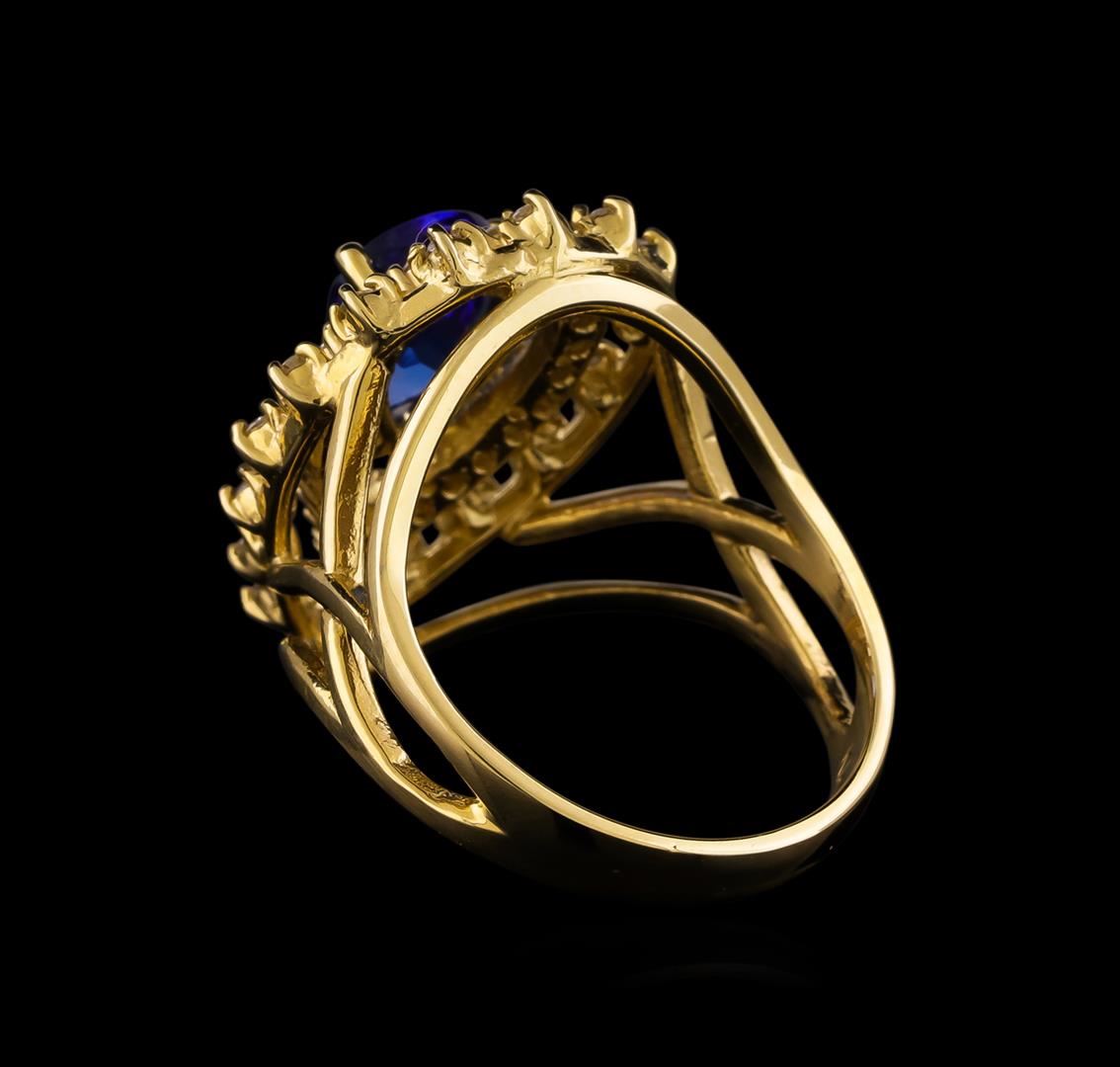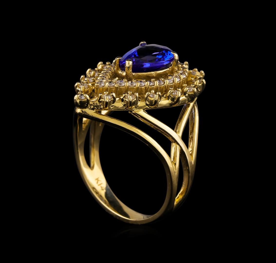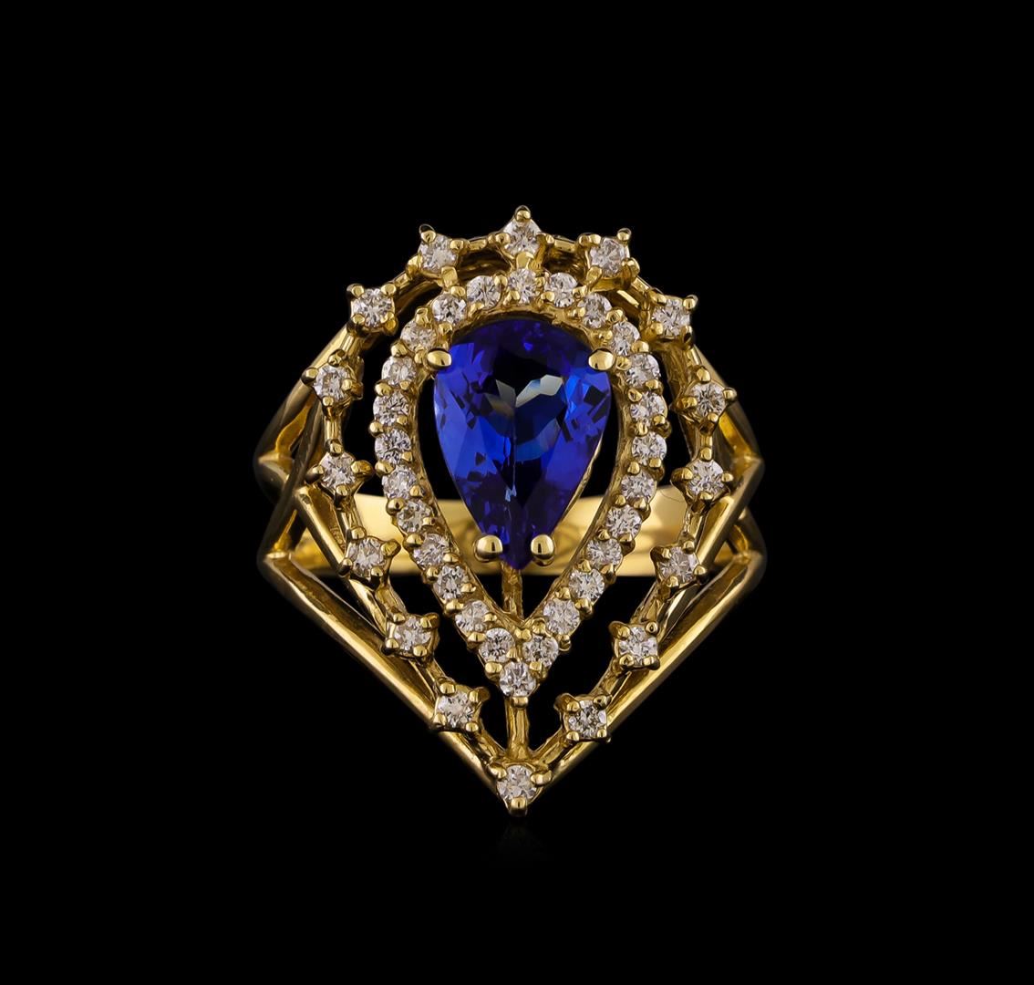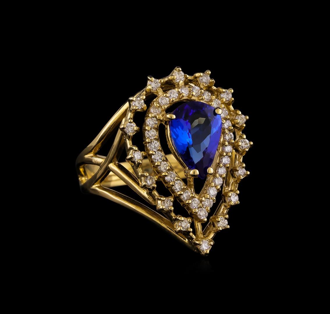 One electronically tested 14KT yellow gold ladies combination cast & assembled tanzanite and diamond ring with a split shank with a bright polish finish. Identified with markings of "K14". Condition is new. Containing: One prong set pear modified brilliant cut natural tanzanite, measuring 9.89 x 6.78 x 3.77mm, approximate weight of 1.69ct., clarity is eye clean, type I, medium, moderately strong, bluish violet color, (GIA bV 5/4), cut is good. Forty-One prong set round brilliant cut diamonds, measuring 1.50 - 1.30 x 0.84mm (depth est.) approximate total weight of 41 Stones = 0.41ct. Clarity: I-1. Color: K - L, Cut is Good. Colored gemstones are presumed to have been subjected to commonly used enhancement processes. All diamonds and colored gemstones are graded in the mounting, unless otherwise stated. Total Weight of Colored Stones 1.69ct. Total Weight of Diamonds 0.41ct. Total Weight of Ring 6.90 grams. GGL Appraised at $5,245.00.