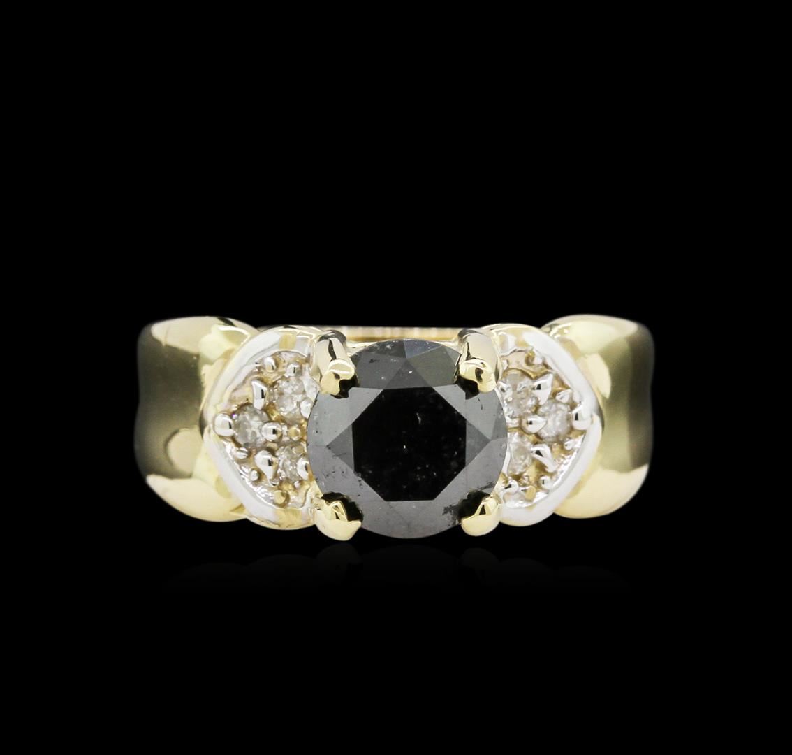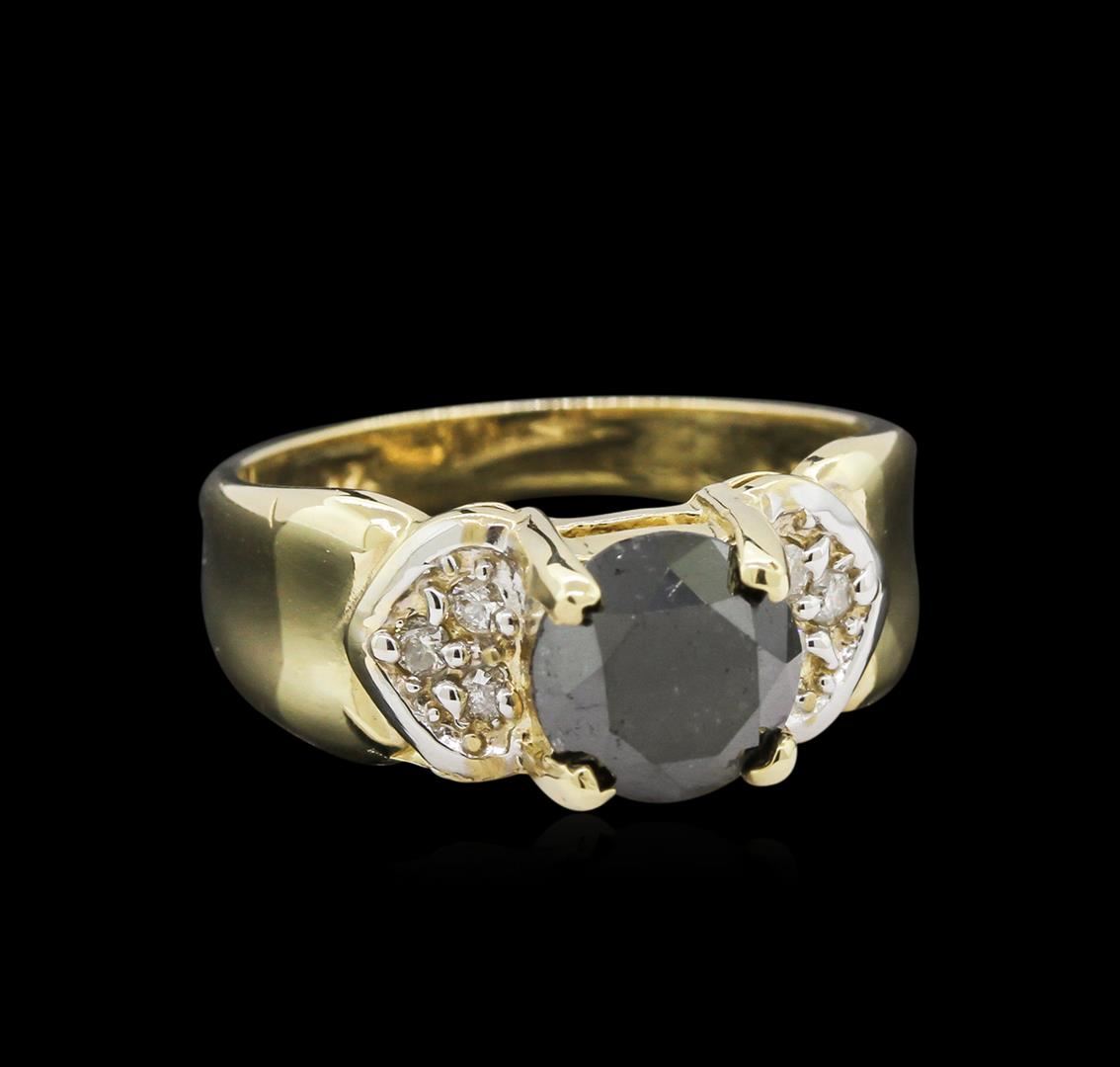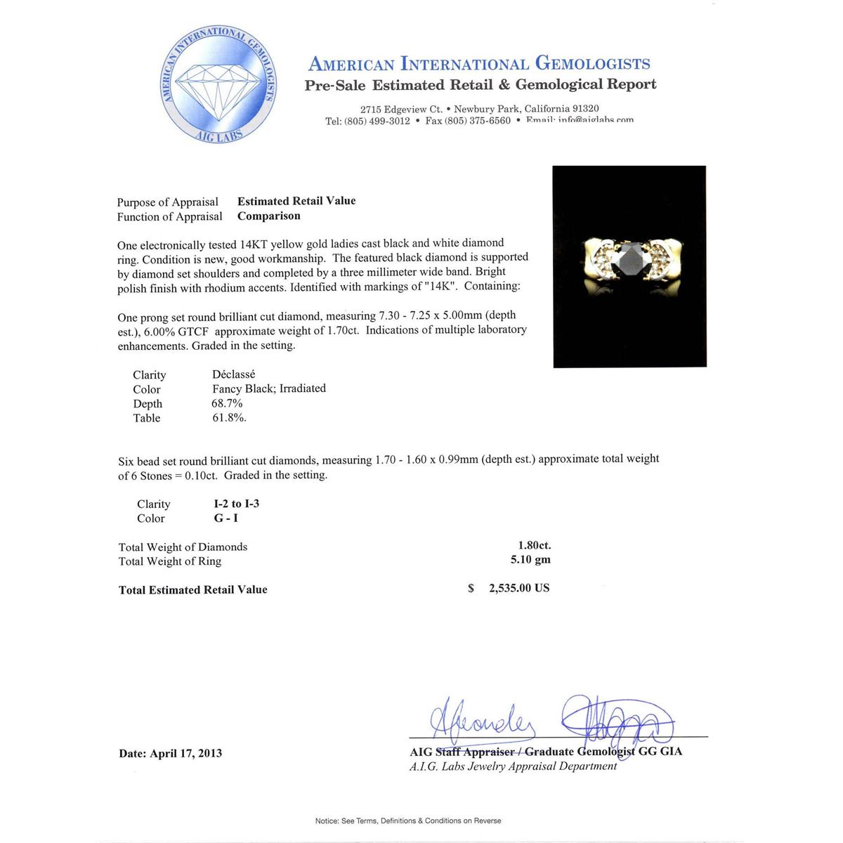 One electronically tested 14KT yellow gold ladies cast black and white diamond ring. Condition is new, good workmanship. The featured black diamond is supported by diamond set shoulders and completed by a three millimeter wide band. Bright polish finish with rhodium accents. Identified with markings of "14K". Containing: One prong set round brilliant cut diamond, measuring 7.30 - 7.25 x 5.00mm (depth est.), 6.00% GTCF approximate weight of 1.70ct. Indications of multiple laboratory enhancements. Graded in the setting. Clarity Declasse. Color Fancy Black; Irradiated. Depth 68.7%. Table 61.8%. Six bead set round brilliant cut diamonds, measuring 1.70 - 1.60 x 0.99mm (depth est.) approximate total weight of 6 Stones = 0.10ct. Graded in the setting. Clarity I-2 to I-3. Color G - I. Total Weight of Diamonds 1.80ct. Total Weight of Ring 5.10 gm. AIG Appraised at $2,535.00.