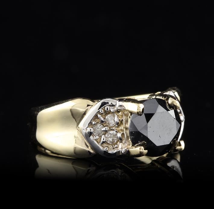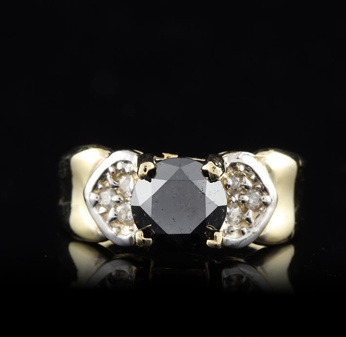 One electronically tested 14KT yellow gold ladies cast black and white diamond ring. Condition is new, good workmanship. The featured black diamond is supported by diamond set shoulders and completed by a three millimeter wide band. Bright polish finish with rhodium accents. Identified with markings of "14K". Containing: One prong set round brilliant cut diamond, measuring 7.30 - 7.25 x 5.00mm (depth est.), 6.00% GTCF approximate weight of 1.70ct. Indications of multiple laboratory enhancements. Graded in the setting. Clarity Declasse. Color Fancy Black; Irradiated. Depth 68.7%. Table 61.8%. Six bead set round brilliant cut diamonds, measuring 1.70 - 1.60 x 0.99mm (depth est.) approximate total weight of 6 Stones = 0.10ct. Graded in the setting. Clarity I-2 to I-3. Color G - I. Total Weight of Diamonds 1.80ct. Total Weight of Ring 5.10 gm. AIG Appraised at $2,535.00.