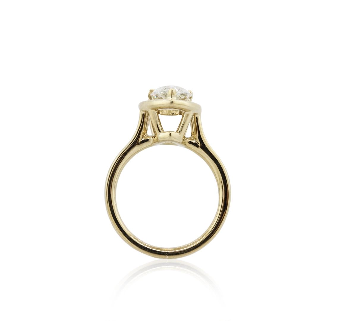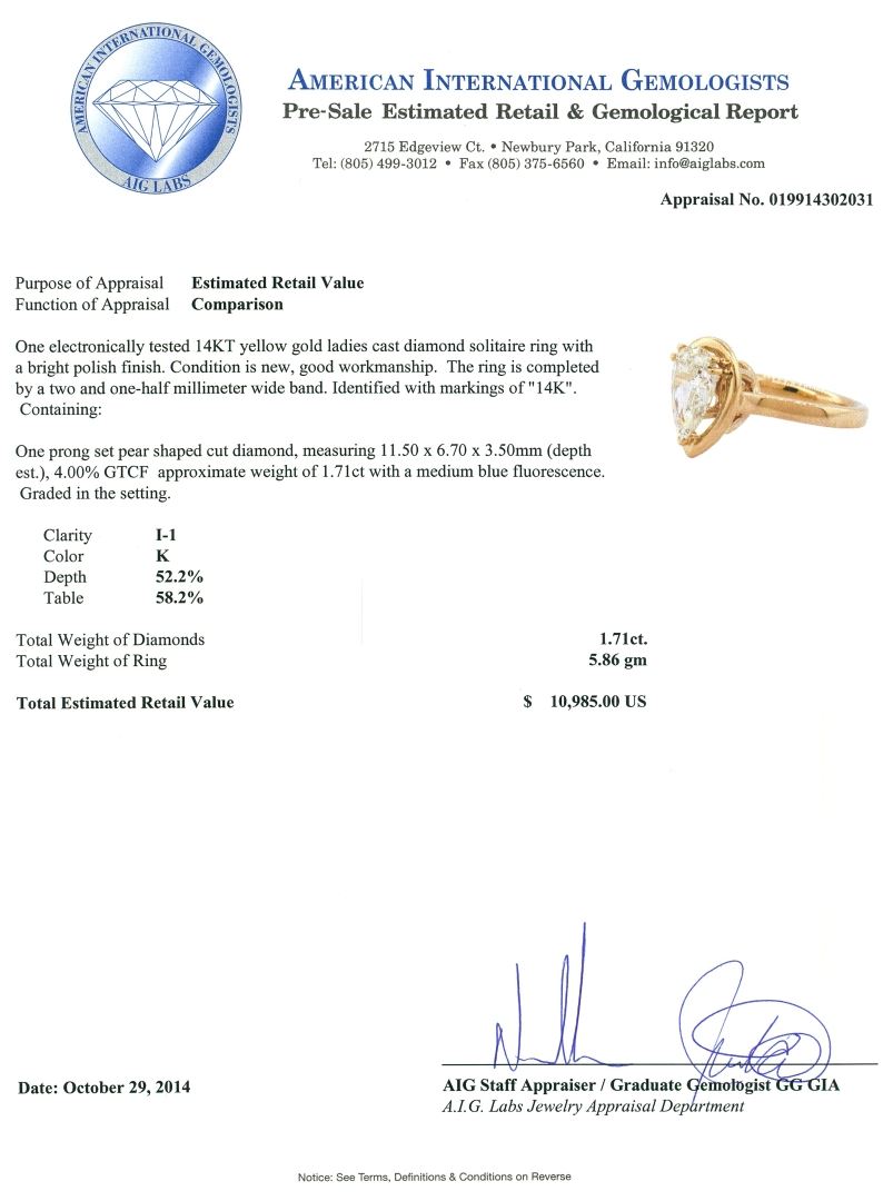 One electronically tested 14KT yellow gold ladies cast diamond solitaire ring with a bright polish finish. The ring is completed by a two and one-half millimeter wide band. Identified with markings of "14K". Condition is new, good workmanship. Containing: One prong set pear shaped cut diamond, measuring 11.50 x 6.70 x 3.50mm (depth est.), 4.00.%. GTCF approximate weight of 1.71ct with a medium blue fluorescence. Graded in the setting. Clarity: I-1. Color: 52.2%. Table 58.2%. Total Weight of Diamonds 1.71ct. Total Weight of Ring 5.86 grams. AIG Appraised at $10,985.00.