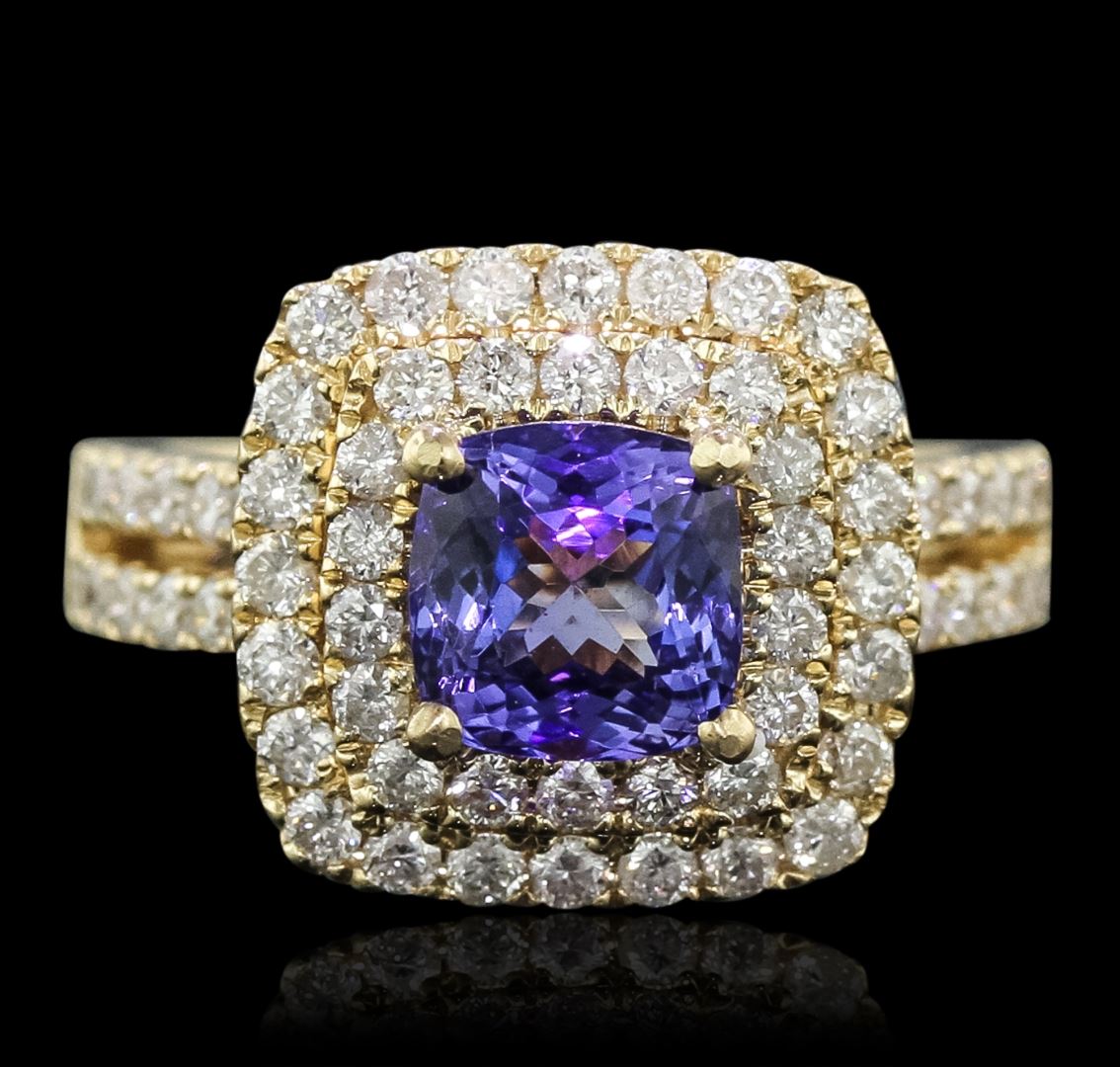One electronically tested 14KT yellow gold Ladies combination cast & assembled ring with a bright polish finish. Condition is new. Identified with markings of "14K". Containing: One prong set square cushion modified brilliant cut natural tanzanite, measuring 7.00 x 7.00 x 4.55mm, approximate weight of 1.76ct., clarity is eye clean, type I, medium, moderately strong, bluish violet color, (GIA bV 5/4), cut is good. Colored gemstones are presumed to have been subjected to commonly used color/clarity enhancement processes. Seventy prong set round brilliant cut diamonds, measuring 1.50 - 1.50 x 0.90mm (depth est.) approximate. Total Weight of 70 Stones = 0.86ct. Clarity: I-1 to I-2. Color: J - K, Cut is Good. Total Weight of Colored Stones 1.76ct. Total Weight of Diamonds 0.86ct. Total Weight of Ring 6.80 grams. GGL Appraised at $6,920.00.