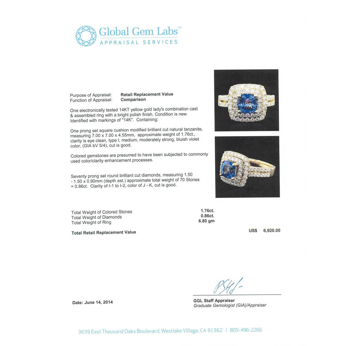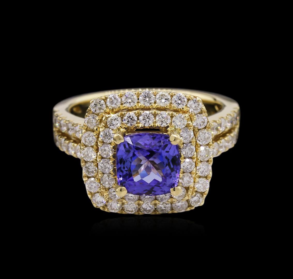 One electronically tested 14KT yellow gold Ladies combination cast & assembled ring with a bright polish finish. Condition is new. Identified with markings of "14K". Containing: One prong set square cushion modified brilliant cut natural tanzanite, measuring 7.00 x 7.00 x 4.55mm, approximate weight of 1.76ct., clarity is eye clean, type I, medium, moderately strong, bluish violet color, (GIA bV 5/4), cut is good. Colored gemstones are presumed to have been subjected to commonly used color/clarity enhancement processes. Seventy prong set round brilliant cut diamonds, measuring 1.50 - 1.50 x 0.90mm (depth est.) approximate. Total Weight of 70 Stones = 0.86ct. Clarity: I-1 to I-2. Color: J - K, Cut is Good. Total Weight of Colored Stones 1.76ct. Total Weight of Diamonds 0.86ct. Total Weight of Ring 6.80 grams. GGL Appraised at $6,920.00.