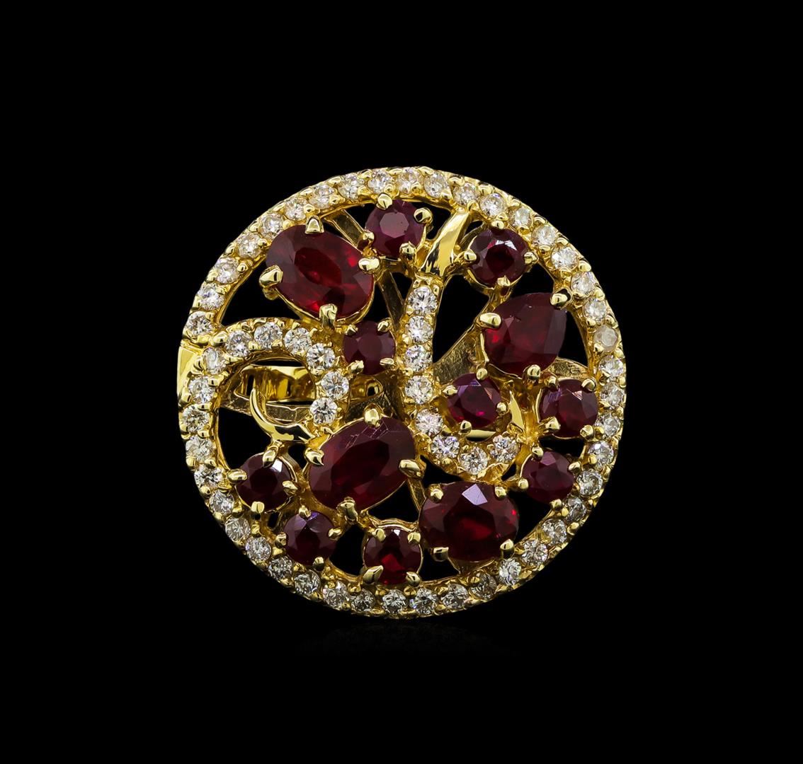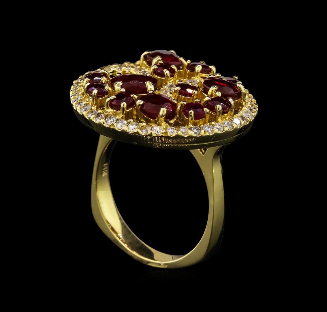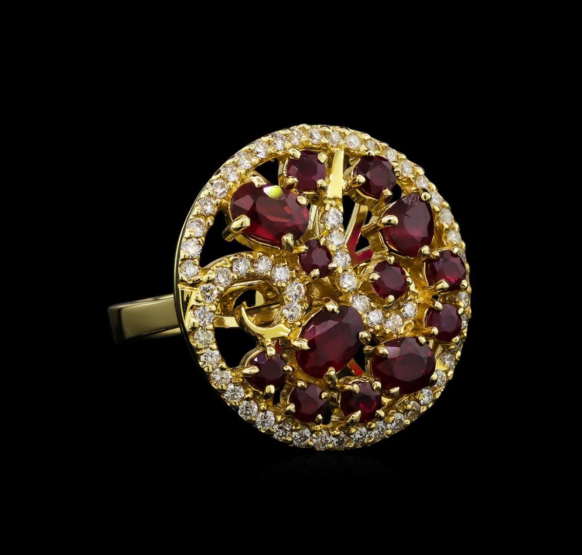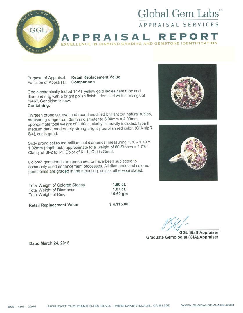 One electronically tested 14KT yellow gold ladies cast ruby and diamond ring with a bright polish finish. Identified with markings of "14K". Condition is new. Containing: Thirteen prong set oval modified brilliant cut natural rubies, measuring 2.00 x 3.00 x 1.95mm, approximate total weight of 1.30ct., clarity is heavily included, type II, medium dark, moderately strong, slightly purplish red color, (GIA slpR 6/4), cut is good. Sixty prong set round brilliant cut diamonds, measuring 1.70 - 1.70 x 1.02mm (depth est.) approximate total weight of 60 Stones = 1.07ct. Clarity: SI-2 to I-1. Color: K - L, Cut is Good. Colored gemstones are presumed to have been subjected to commonly used enhancement processes. All diamonds and colored gemstones are graded in the mounting, unless otherwise stated. Total Weight of Colored Stones 1.30ct. Total Weight of Diamonds 1.07ct. Total Weight of Ring 10.60 grams. GGL Appraised at $4,115.00.