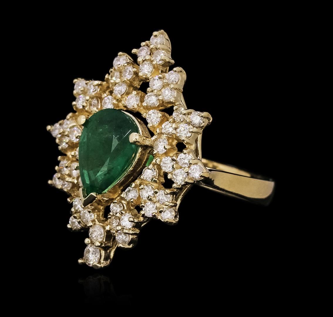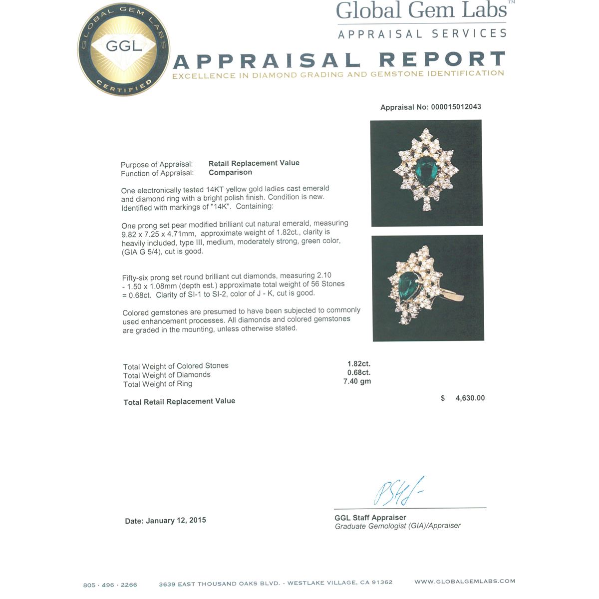 One electronically tested 14KT yellow gold ladies cast emerald and diamond ring with a bright polish finish. Identified with markings of "14K". Condition is new. Containing: One prong set pear modified brilliant cut natural emerald, measuring 9.82 x 7.25 x 4.71mm, approximate weight of 1.82ct., clarity is heavily included, type III, medium, moderately strong, green color, (GIA G 5/4), cut is good. Fifty-Six prong set round brilliant cut diamonds, measuring 2.10 - 1.50 x 1.08mm (depth est.) approximate total weight of 56 Stones = 0.68ct. Clarity: SI-1 to SI-2. Color: J - K, Cut is Good. Colored gemstones are presumed to have been subjected to commonly used enhancement processes. All diamonds and colored gemstones are graded in the mounting, unless otherwise stated. Total Weight of Colored Stones 1.82ct. Total Weight of Diamonds 0.68ct. Total Weight of Ring 7.40 grams. GGL Appraised at $4,630.00.