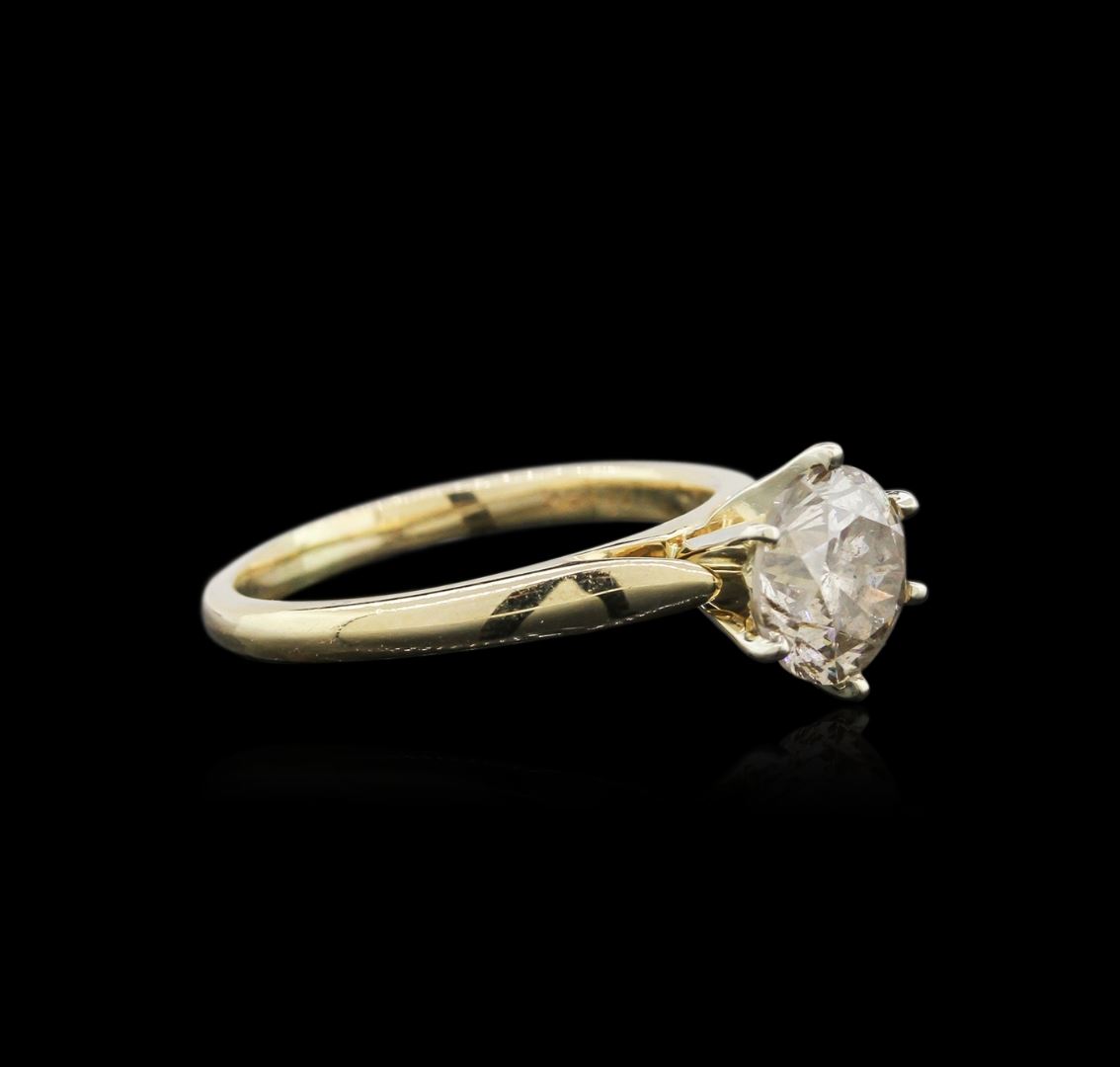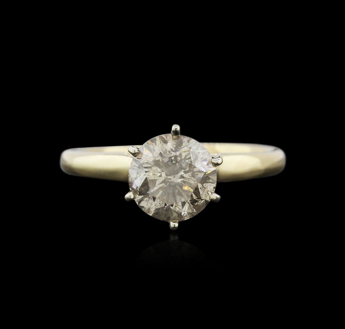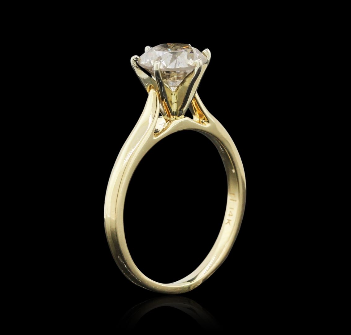 One electronically tested 14KT yellow gold ladies cast diamond solitaire ring with a bright polish finish. Identified with markings of "14K". Condition is good. Containing: One prong set round brilliant cut diamond, measuring 8.00 - 8.00 x 4.80mm (depth est.) approximate weight of 1.87ct. Clarity: I-3. Color: K, Cut is Good. All diamonds are graded in the mounting, unless otherwise stated. Total Weight of Diamonds 1.87ct. Total Weight of Solitaire Ring 4.10 grams. GGL Appraised at $4,805.00.