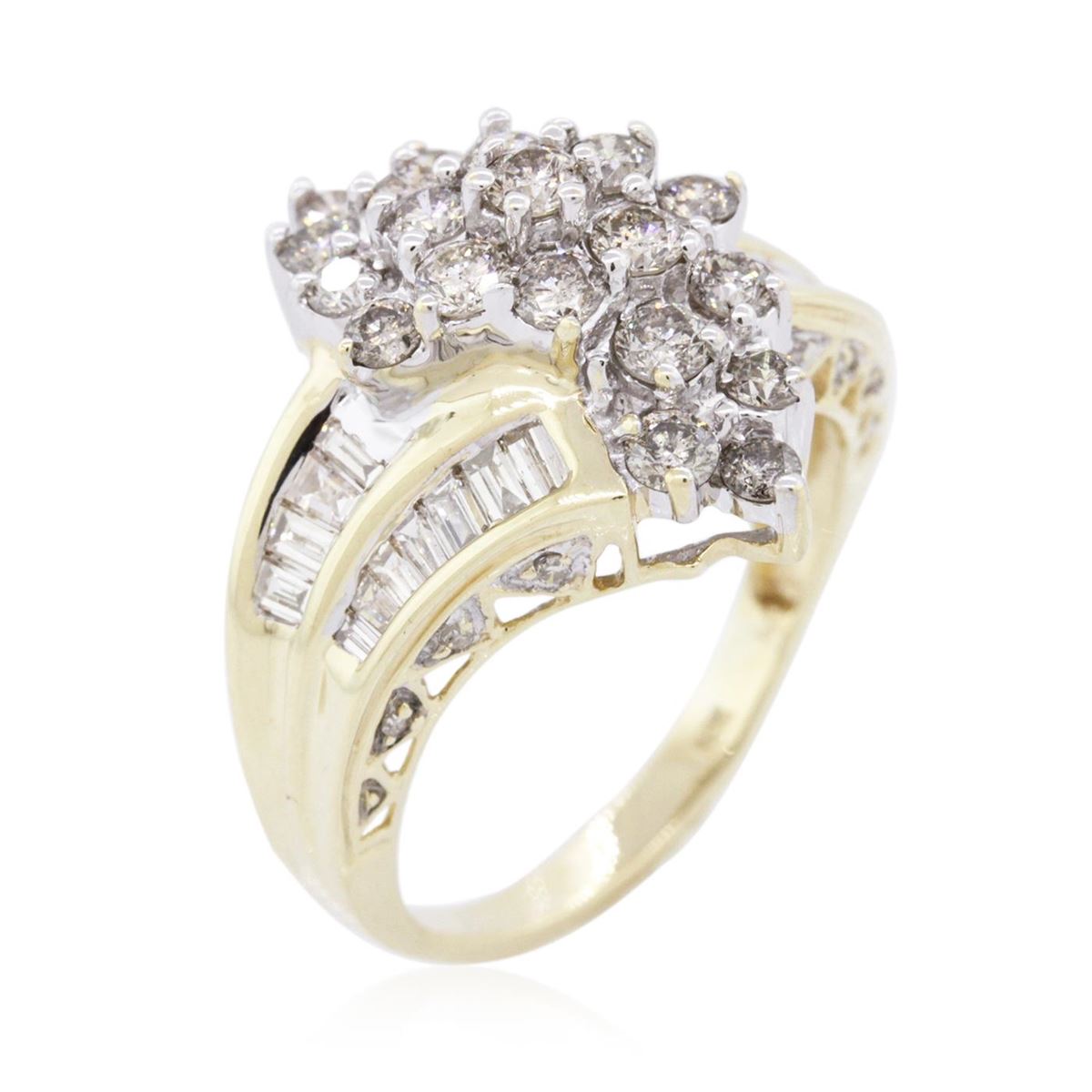 One electronically tested 14KT yellow gold ladies cast diamond ring. The ring features an organized diamond cluster set within a stylized diamond bypass design, completed by a two and one-half millimeter wide band. Bright polish finish with rhodium accents. Identified with markings of "14K". Condition is good. Containing: Eighteen prong set round brilliant cut diamonds, measuring 2.80 - 2.50 x 1.59mm (depth est.) approximate total weight of 18 Stones = 1.32ct. Color grade is an average for the group. Graded in the setting. Clarity: I-1 to I-2 Twelve prong set single cut diamonds, measuring 1.00 - 1.00 x 0.60mm (depth est.) approximate total weight of 12 Stones = 0.06ct. Color grade is an average for the group. Graded in the setting. Clarity: I-1 Twenty-Two channel set baguette cut diamonds, measuring from 2.10 x 1.20 x 0.84mm (depth est.) to 2.50 x 1.30 x 0.91mm (depth est.) approximate total weight of 22 Stones = 0.50ct. Graded in the setting. Clarity: VS-2 to SI-1. Color: I - K. Total Weight of Diamonds 1.88ct. Total Weight of Ring 5.84 grams. AIG Appraised at $4,315.00.