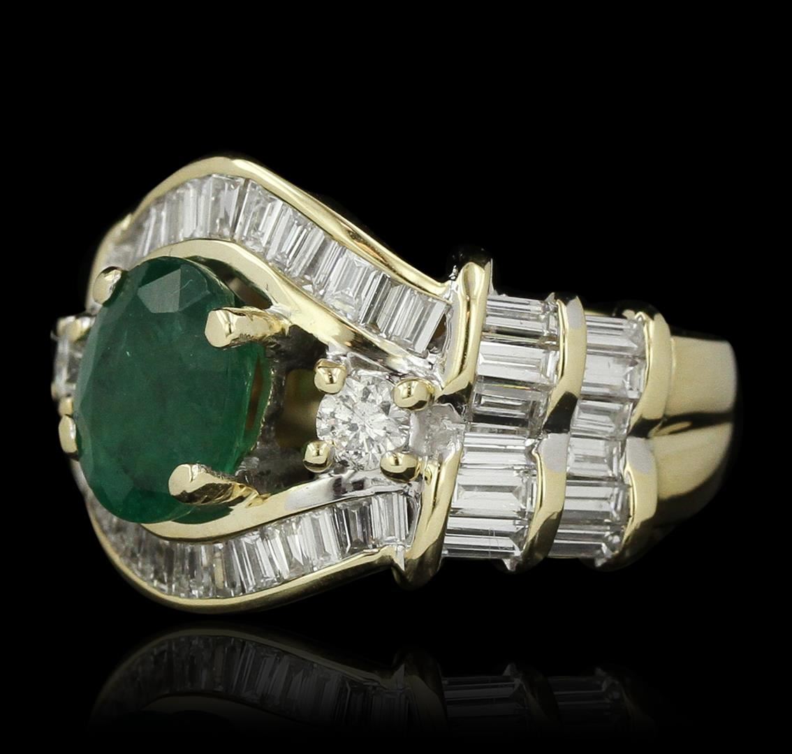 One electronically tested 14KT yellow gold ladies cast emerald and diamond ring. Condition is good. The featured emerald is accented by a single diamond on either side supported by mirroring diamond ribbons, completed by a five millimeter wide band. Identified with markings of "14K". Containing: One prong set oval mixed cut natural emerald, measuring 8.95 x 6.90 x 5.40mm, 6%. bulge factor, approximate weight of 1.96ct., clarity is heavily included, type III, medium dark, moderately strong, very slightly bluish green color, (GIA vslbG 6/4), cut is good. Transmitting light with a minimum of distortion, transparent. Naturally occurring internal & external characteristics are present. Indications of oil residue. Graded in the setting. Two prong set round brilliant cut diamonds, measuring 3.30 - 3.20 x 1.95mm (depth est.) approximate. Total Weight of 2 Stones = 0.27ct. Graded in the setting. Clarity: SI-1 to SI-2. Color: H - I Twenty-Four channel set baguette cut (tapered) diamonds, measuring from 2.90 x 1.60 x 1.12mm (depth est.) to 3.20 x 1.40 x 0.98mm (depth est.) approximate. Total Weight of 24 Stones = 1.05ct. Graded in the setting. Clarity: VS-2 to SI-2. Color: G - I Twenty-Six channel set baguette cut (tapered) diamonds, measuring from 2.00 x 1.30 x 0.91mm (depth est.) to 2.20 x 1.60 x 1.12mm (depth est.) approximate. Total Weight of 26 Stones = 0.75ct. Graded in the setting. Clarity: VS-1 to SI-1. Color: G - I. Total Weight of Colored Stones 1.96ct. Total Weight of Diamonds 2.07ct. Total Weight of Ring 12.44 grams. AIG Appraised at $11,260.00.