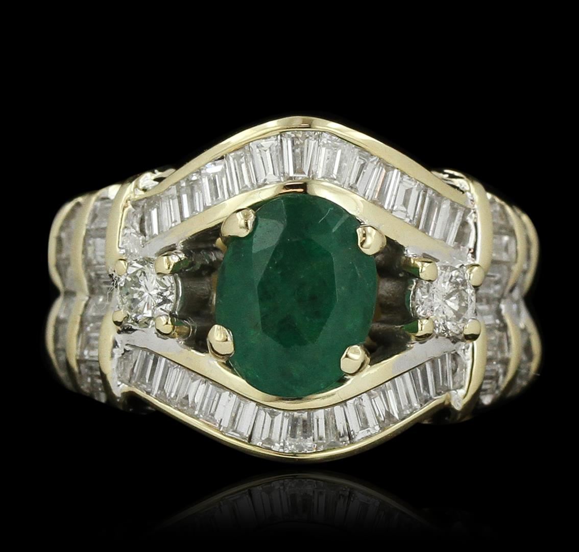 One electronically tested 14KT yellow gold ladies cast emerald and diamond ring. Condition is good. The featured emerald is accented by a single diamond on either side supported by mirroring diamond ribbons, completed by a five millimeter wide band. Identified with markings of "14K". Containing: One prong set oval mixed cut natural emerald, measuring 8.95 x 6.90 x 5.40mm, 6%. bulge factor, approximate weight of 1.96ct., clarity is heavily included, type III, medium dark, moderately strong, very slightly bluish green color, (GIA vslbG 6/4), cut is good. Transmitting light with a minimum of distortion, transparent. Naturally occurring internal & external characteristics are present. Indications of oil residue. Graded in the setting. Two prong set round brilliant cut diamonds, measuring 3.30 - 3.20 x 1.95mm (depth est.) approximate. Total Weight of 2 Stones = 0.27ct. Graded in the setting. Clarity: SI-1 to SI-2. Color: H - I Twenty-Four channel set baguette cut (tapered) diamonds, measuring from 2.90 x 1.60 x 1.12mm (depth est.) to 3.20 x 1.40 x 0.98mm (depth est.) approximate. Total Weight of 24 Stones = 1.05ct. Graded in the setting. Clarity: VS-2 to SI-2. Color: G - I Twenty-Six channel set baguette cut (tapered) diamonds, measuring from 2.00 x 1.30 x 0.91mm (depth est.) to 2.20 x 1.60 x 1.12mm (depth est.) approximate. Total Weight of 26 Stones = 0.75ct. Graded in the setting. Clarity: VS-1 to SI-1. Color: G - I. Total Weight of Colored Stones 1.96ct. Total Weight of Diamonds 2.07ct. Total Weight of Ring 12.44 grams. AIG Appraised at $11,260.00.