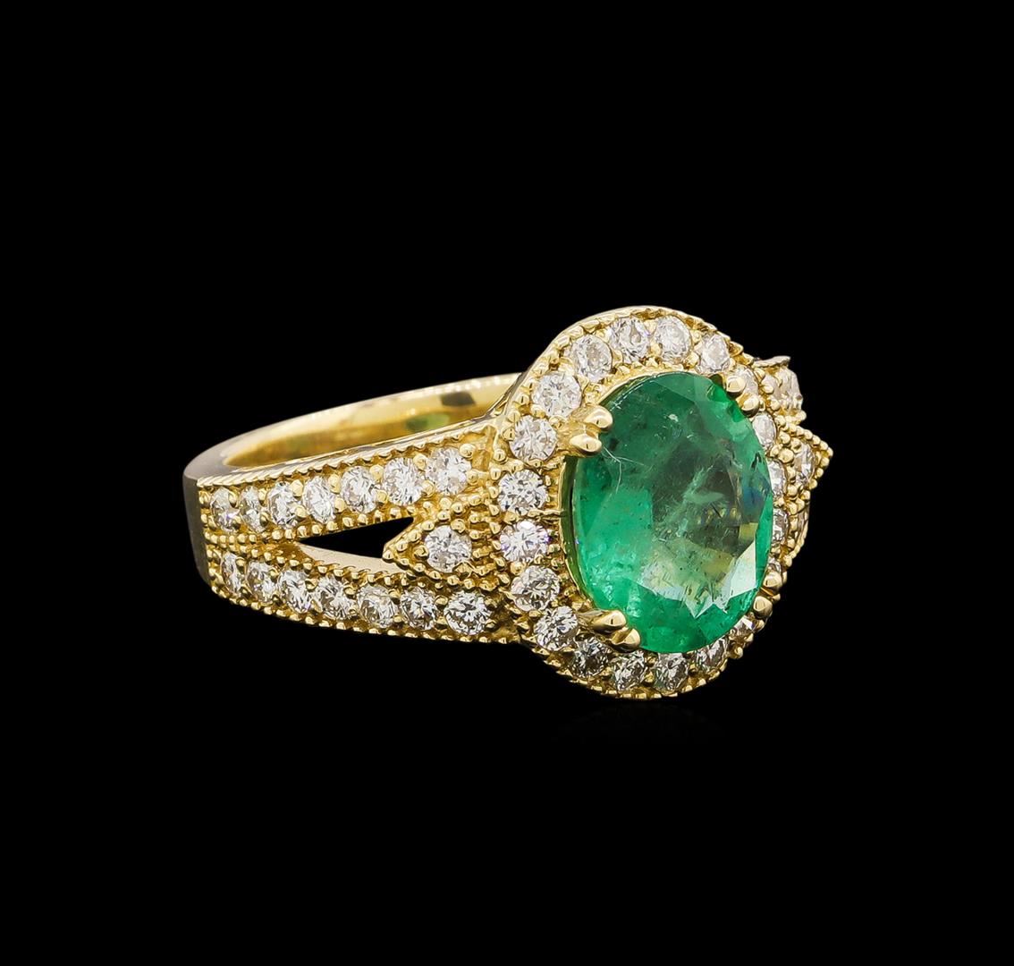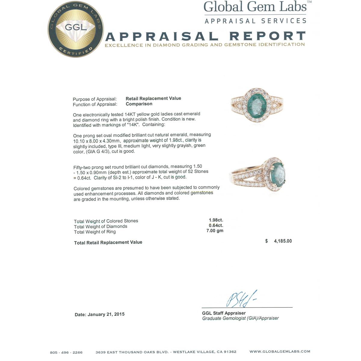 One electronically tested 14KT yellow gold ladies cast emerald and diamond ring with a bright polish finish. Identified with markings of "14K". Condition is new. Containing: One prong set oval modified brilliant cut natural emerald, measuring 10.10 x 8.00 x 4.30mm, approximate weight of 1.98ct., clarity is slightly included, type III, medium light, very slightly grayish, green color, (GIA G 4/3), cut is good. Fifty-Two prong set round brilliant cut diamonds, measuring 1.50 - 1.50 x 0.90mm (depth est.) approximate total weight of 52 Stones = 0.64ct. Clarity: SI-2 to I-1. Color: J - K, Cut is Good. Colored gemstones are presumed to have been subjected to commonly used enhancement processes. All diamonds and colored gemstones are graded in the mounting, unless otherwise stated. Total Weight of Colored Stones 1.98ct. Total Weight of Diamonds 0.64ct. Total Weight of Ring 7.00 grams. GGL Appraised at $4,185.00.