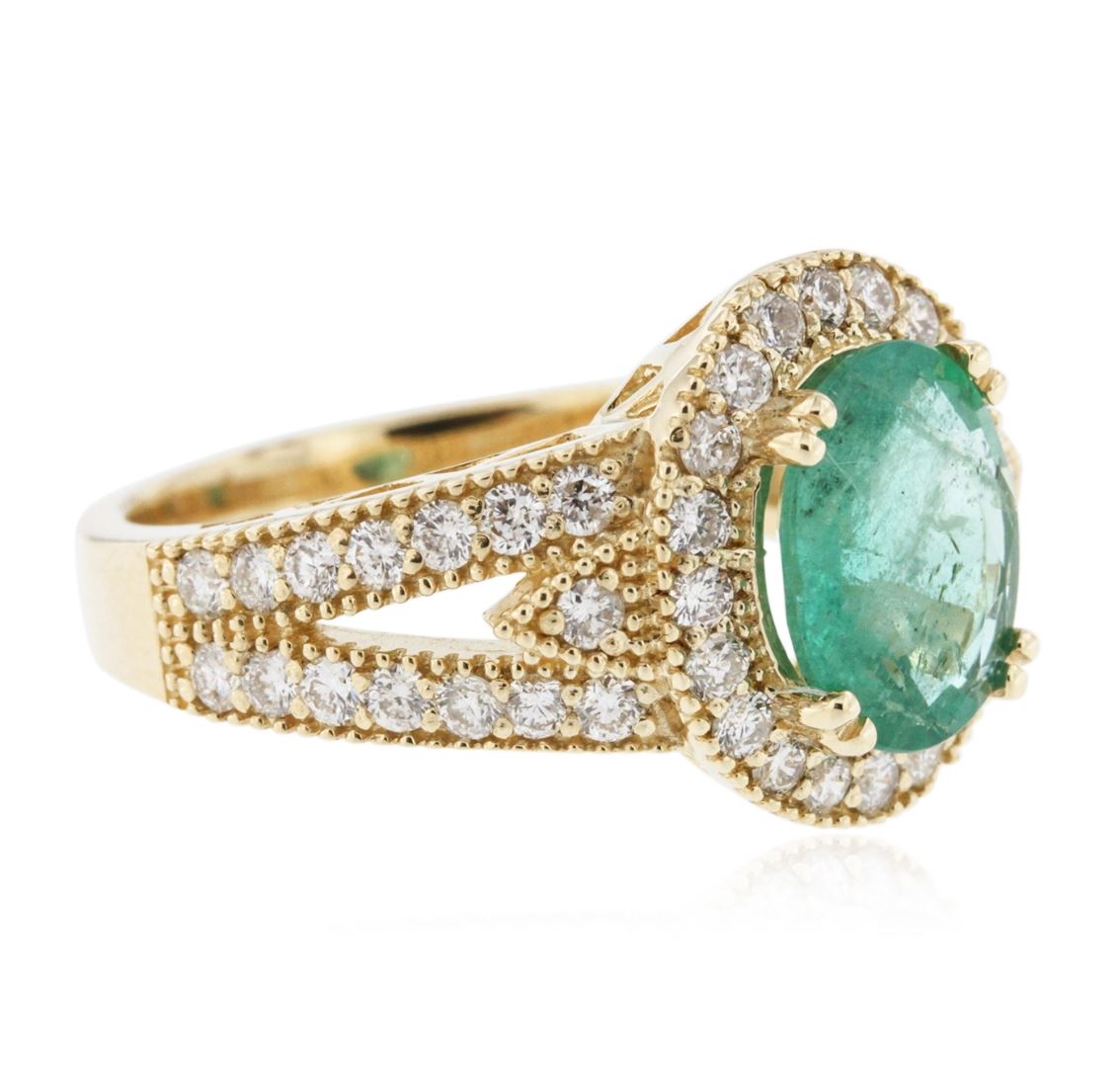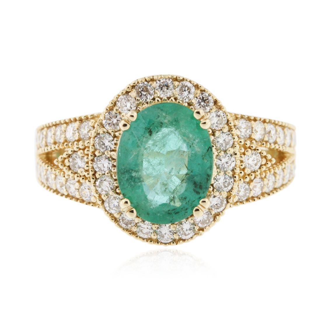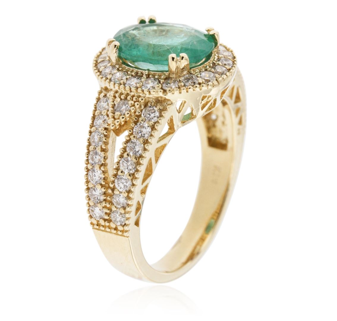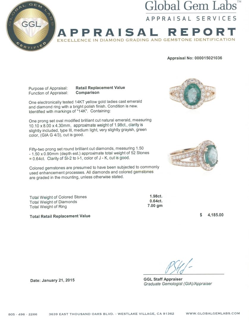 One electronically tested 14KT yellow gold ladies cast emerald and diamond ring with a bright polish finish. Identified with markings of "14K". Condition is new. Containing: One prong set oval modified brilliant cut natural emerald, measuring 10.10 x 8.00 x 4.30mm, approximate weight of 1.98ct., clarity is slightly included, type III, medium light, very slightly grayish, green color, (GIA G 4/3), cut is good. Fifty-Two prong set round brilliant cut diamonds, measuring 1.50 - 1.50 x 0.90mm (depth est.) approximate total weight of 52 Stones = 0.64ct. Clarity: SI-2 to I-1. Color: J - K, Cut is Good. Colored gemstones are presumed to have been subjected to commonly used enhancement processes. All diamonds and colored gemstones are graded in the mounting, unless otherwise stated. Total Weight of Colored Stones 1.98ct. Total Weight of Diamonds 0.64ct. Total Weight of Ring 7.00 grams. GGL Appraised at $4,185.00.