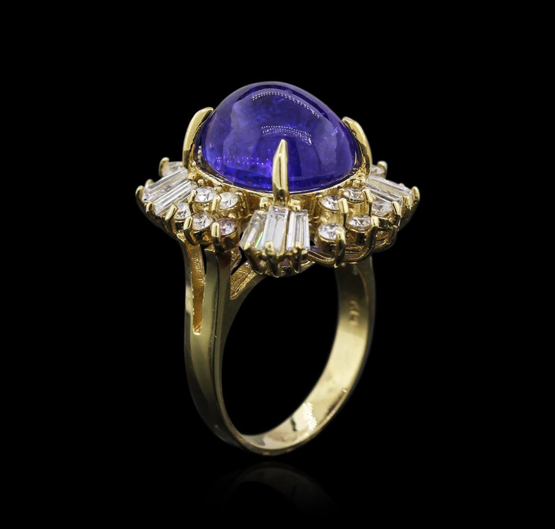 One electronically tested 14KT yellow gold ladies cast tanzanite and diamond ring with a bright polish finish. Identified with markings of "14K". Condition is new. Containing: One prong set oval cabochon cut natural tanzanite, measuring 14.20 x 11.00 x 7.15mm, approximate weight of 10.10ct., clarity is heavily included, type I, medium, moderately strong, violetish blue color, (GIA vB 5/4), cut is good. Twenty prong set round brilliant cut diamonds, measuring 2.00 - 2.00 x 1.20mm (depth est.) approximate total weight of 20 Stones = 0.58ct. Clarity: I-1 to I-2. Color: H - I, Cut is Good. Twelve prong set baguette cut diamonds, measuring from 4.00 x 1.50 x 1.28mm (depth est.) to 4.20 x 1.50 x 1.28mm (depth est.) approximate total weight of 12 Stones = 0.86ct. Clarity: VS-2. Color: I - J, Cut is Good. Diamonds and colored gemstones are graded in the mounting, unless otherwise stated. Colored gemstones are presumed to have been subjected to commonly used enhancement processes. Total Weight of Colored Stones 10.10ct. Total Weight of Diamonds 1.45ct. Total Weight of Ring 9.60 grams. GGL Appraised at $6,645.00.