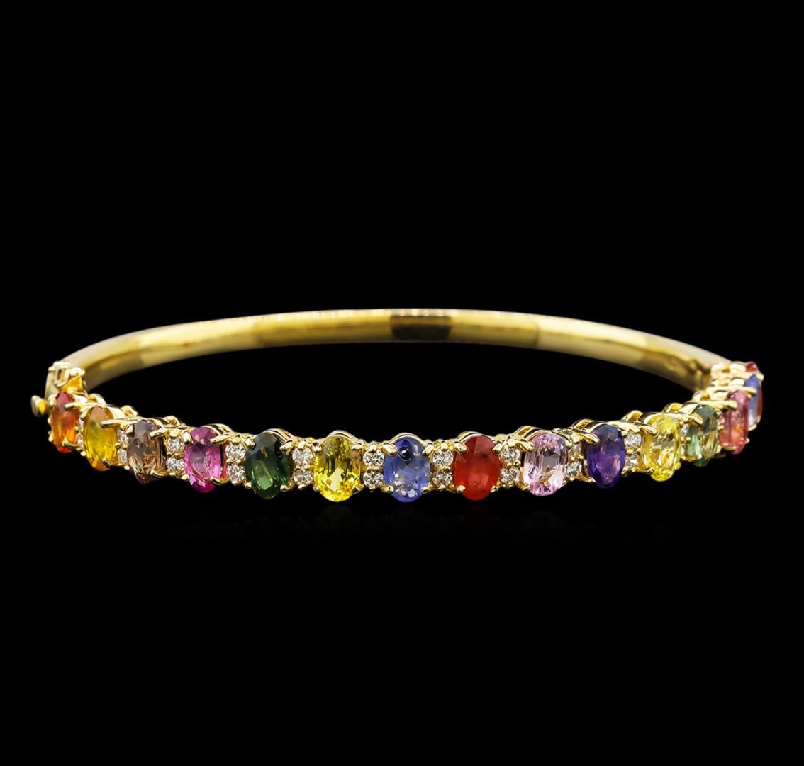 One electronically tested 14KT yellow gold ladies cast sapphire and diamond bangle bracelet with a hidden box clasp with safety closer with a bright polish finish. Identified with markings of "14K". Condition is new. Containing: Fifteen prong set oval modified brilliant cut natural multicolor sapphires, measuring 6.50 x 4.50 x 2.93mm, approximate total weight of 10.15ct., clarity is slightly included, type II, light, slightly grayish, green, yellow, orange, purple, and blue color, (GIA V 3/2), cut is good. Thirty-Two prong set round brilliant cut diamonds, measuring 1.80 - 1.80 x 1.08mm (depth est.) approximate total weight of 32 Stones = 0.73ct. Clarity: SI-1 to I-1. Color: J, Cut is Good. Colored gemstones are presumed to have been subjected to commonly used enhancement processes. All diamonds and colored gemstones are graded in the mounting, unless otherwise stated. Total Weight of Colored Stones 10.15ct. Total Weight of Diamonds 0.73ct. Total Weight of Bangle Bracelet 18.50 grams. GGL Appraised at $4,935.00.