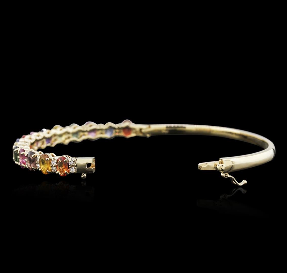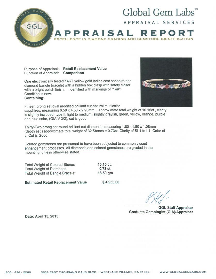 One electronically tested 14KT yellow gold ladies cast sapphire and diamond bangle bracelet with a hidden box clasp with safety closer with a bright polish finish. Identified with markings of "14K". Condition is new. Containing: Fifteen prong set oval modified brilliant cut natural multicolor sapphires, measuring 6.50 x 4.50 x 2.93mm, approximate total weight of 10.15ct., clarity is slightly included, type II, light, slightly grayish, green, yellow, orange, purple, and blue color, (GIA V 3/2), cut is good. Thirty-Two prong set round brilliant cut diamonds, measuring 1.80 - 1.80 x 1.08mm (depth est.) approximate total weight of 32 Stones = 0.73ct. Clarity: SI-1 to I-1. Color: J, Cut is Good. Colored gemstones are presumed to have been subjected to commonly used enhancement processes. All diamonds and colored gemstones are graded in the mounting, unless otherwise stated. Total Weight of Colored Stones 10.15ct. Total Weight of Diamonds 0.73ct. Total Weight of Bangle Bracelet 18.50 grams. GGL Appraised at $4,935.00.