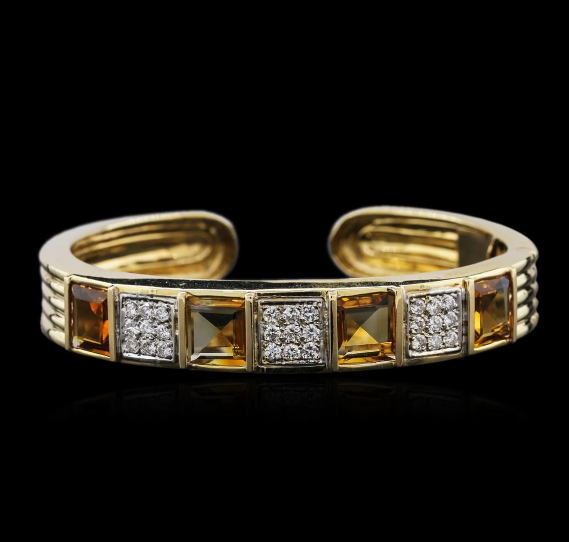 One electronically tested 14KT yellow gold ladies cast citrine and diamond cuff bracelet with a bright polish finish. Identified with markings of "14K". Condition is new. Containing: Four bezel set emerald standard step cut natural citrine quartzes, measuring 8.50 x 8.00 x 5.20mm, approximate total weight of 10.16ct., clarity is eye clean, type I, medium light, slightly brownish, yellow color, (GIA Y 4/2), cut is good. Twenty-Seven prong set round brilliant cut diamonds, measuring 2.20 - 2.20 x 1.32mm (depth est.) approximate total weight of 27 Stones = 1.05ct. Clarity: VS-2 to SI-1. Color: I - J, Cut is Good. All diamonds and colored gemstones are graded in the mounting, unless otherwise stated. Colored gemstones are presumed to have been subjected to commonly used enhancement processes. Total Weight of Colored Stones 10.16ct. Total Weight of Diamonds 1.05ct. Total Weight of Cuff Bracelet 30.00 grams. GGL Appraised at $5,620.00.