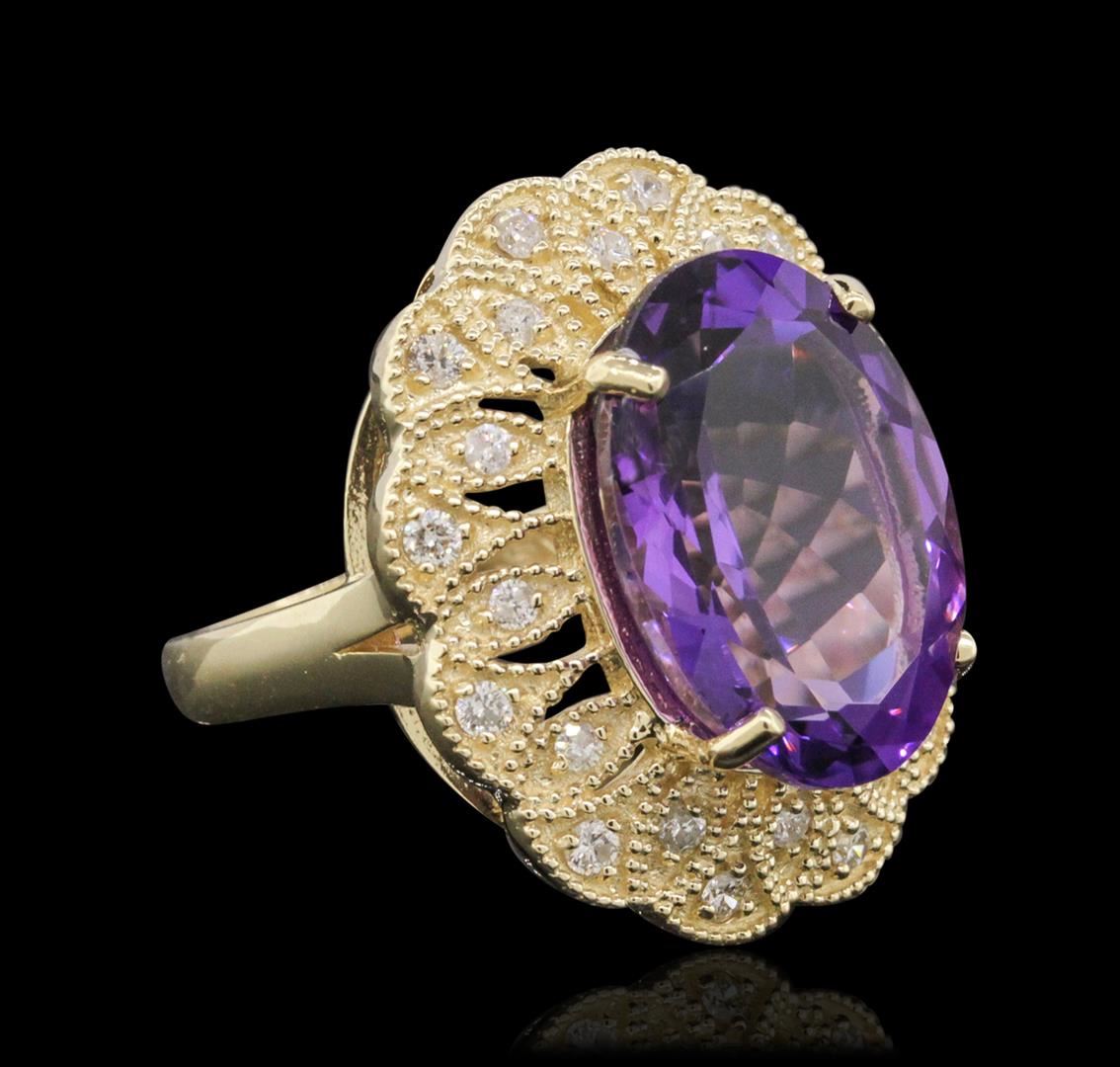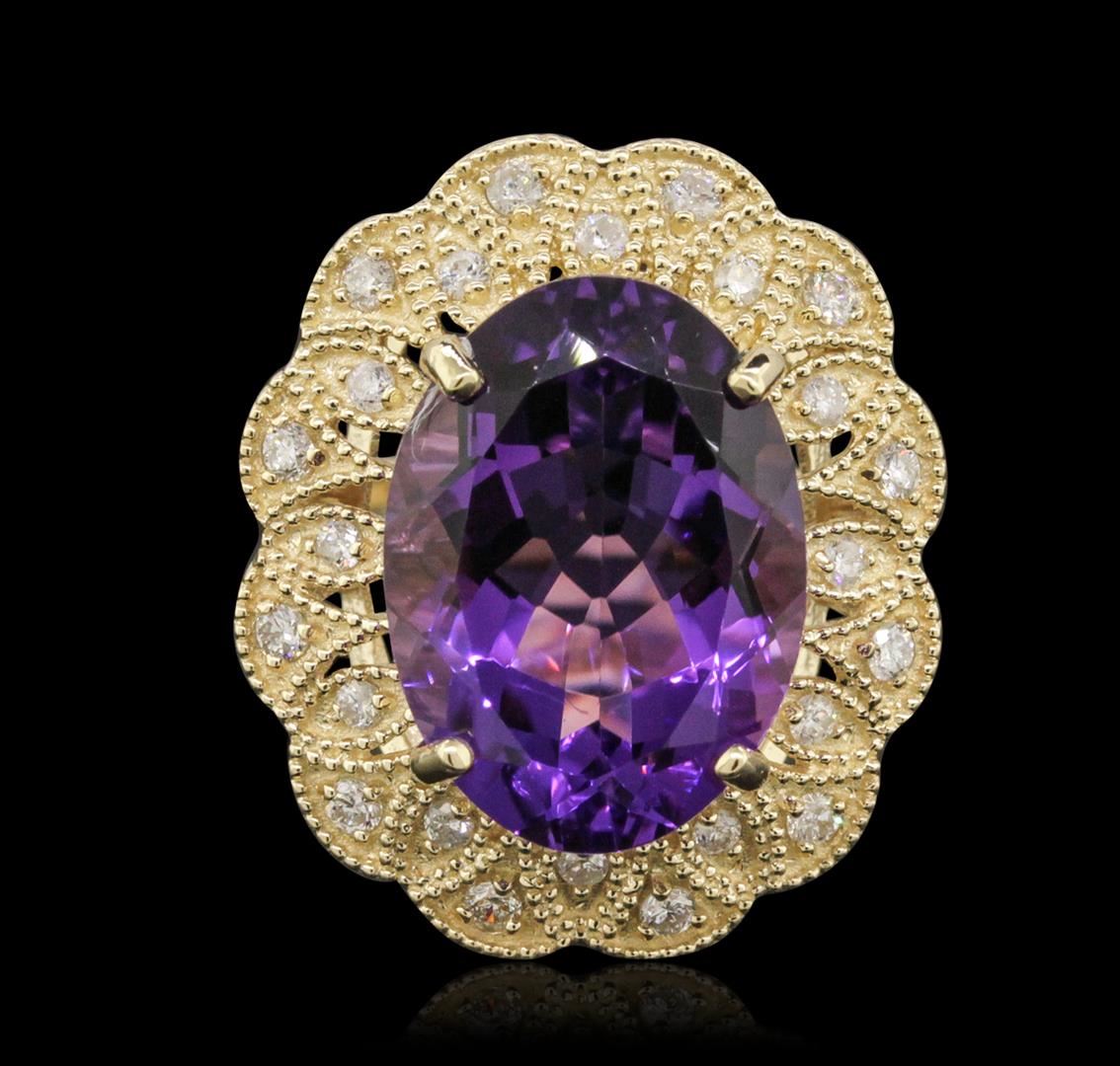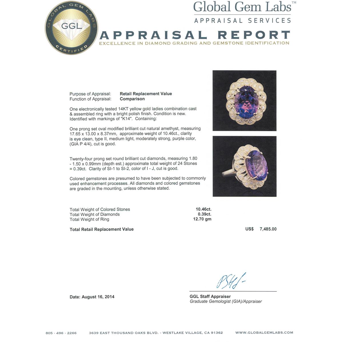 One electronically tested 14KT yellow gold ladies combination cast & assembled ring with a bright polish finish. Condition is new. Identified with markings of "K14". Containing: One prong set oval modified brilliant cut natural amethyst, measuring 17.65 x 13.00 x 8.37mm, approximate weight of 10.46ct., clarity is eye clean, type II, medium light, moderately strong, purple color, (GIA P 4/4), cut is good. Twenty-Four prong set round brilliant cut diamonds, measuring 1.80 - 1.50 x 0.99mm (depth est.) approximate. Total Weight of 24 Stones = 0.39ct. Clarity: SI-1 to SI-2. Color: I - J, Cut is Good. Colored gemstones are presumed to have been subjected to commonly used enhancement processes. All diamonds and colored gemstones are graded in the mounting, unless otherwise stated. Total Weight of Colored Stones 10.46ct. Total Weight of Diamonds 0.39ct. Total Weight of Ring 12.70 grams. GGL Appraised at $7,485.00.