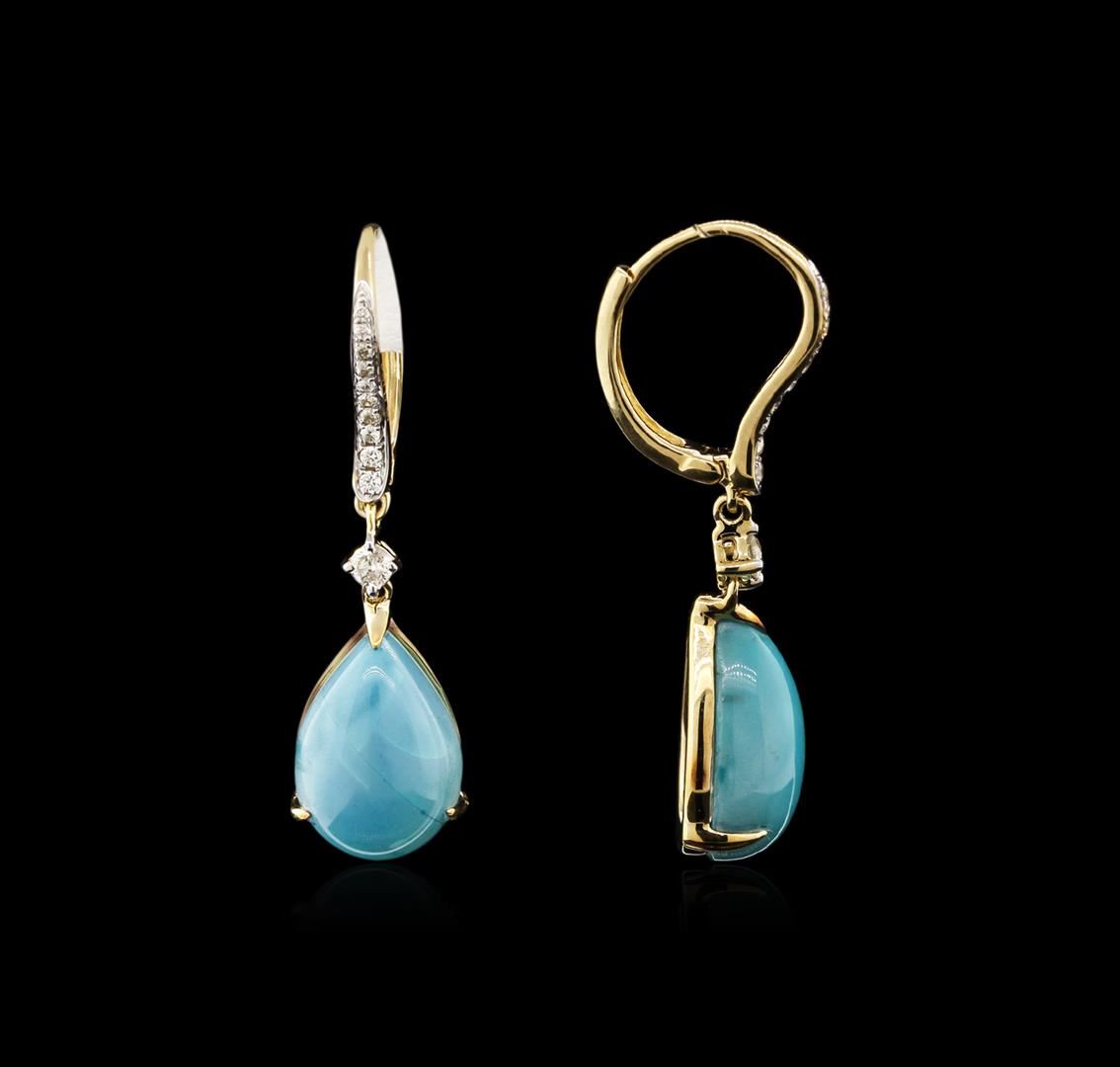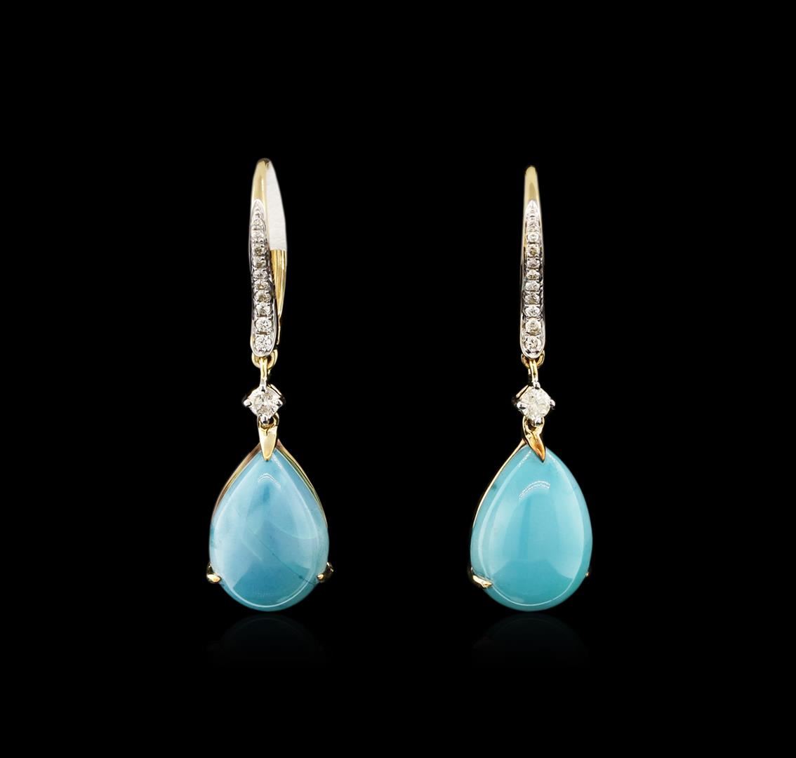 One pair of earrings featuring: 14KT yellow gold weighing 3.12 grams containing two turquoise with a total weight of 10.50ct and 22 round diamonds with a total weight of 0.26ct.