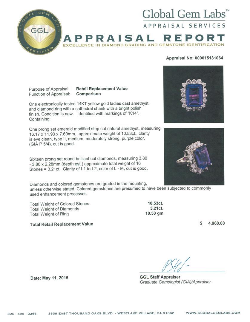 One electronically tested 14KT yellow gold ladies cast amethyst and diamond ring with a cathedral shank with a bright polish finish. Identified with markings of "K14". Condition is new. Containing: One prong set emerald modified step cut natural amethyst, GGL Appraised at $4,960.00.