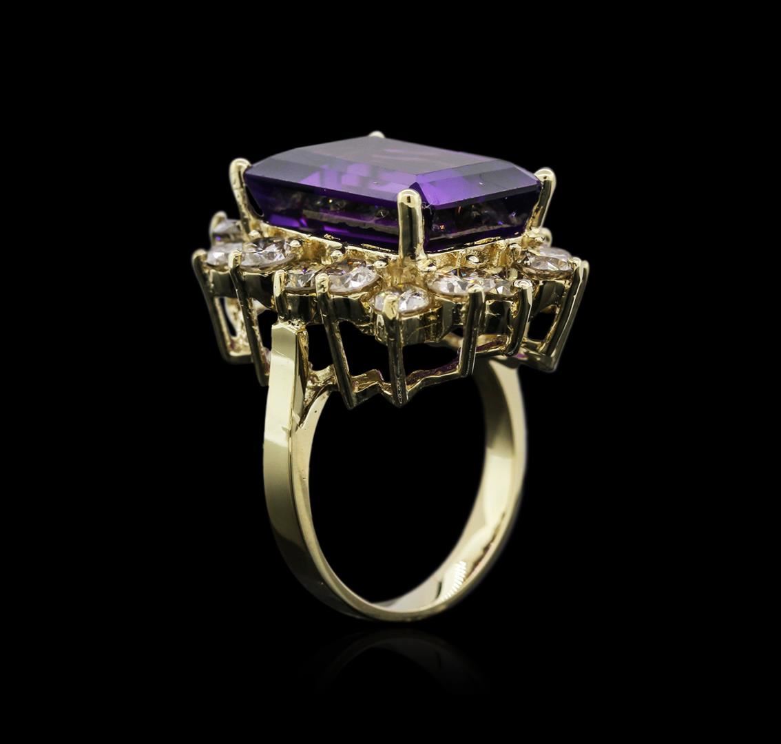 One electronically tested 14KT yellow gold ladies cast amethyst and diamond ring with a cathedral shank with a bright polish finish. Identified with markings of "K14". Condition is new. Containing: One prong set emerald modified step cut natural amethyst, measuring 16.17 x 11.93 x 7.60mm, approximate weight of 10.53ct., clarity is eye clean, type II, medium, moderately strong, purple color, (GIA P 5/4), cut is good. Sixteen prong set round brilliant cut diamonds, measuring 3.80 - 3.80 x 2.28mm (depth est.) approximate total weight of 16 Stones = 3.21ct. Clarity: I-1 to I-2. Color: L - M, Cut is Good. Diamonds and colored gemstones are graded in the mounting, unless otherwise stated. Colored gemstones are presumed to have been subjected to commonly used enhancement processes. Total Weight of Colored Stones 10.53ct. Total Weight of Diamonds 3.21ct. Total Weight of Ring 10.50 grams. GGL Appraised at $4,960.00.