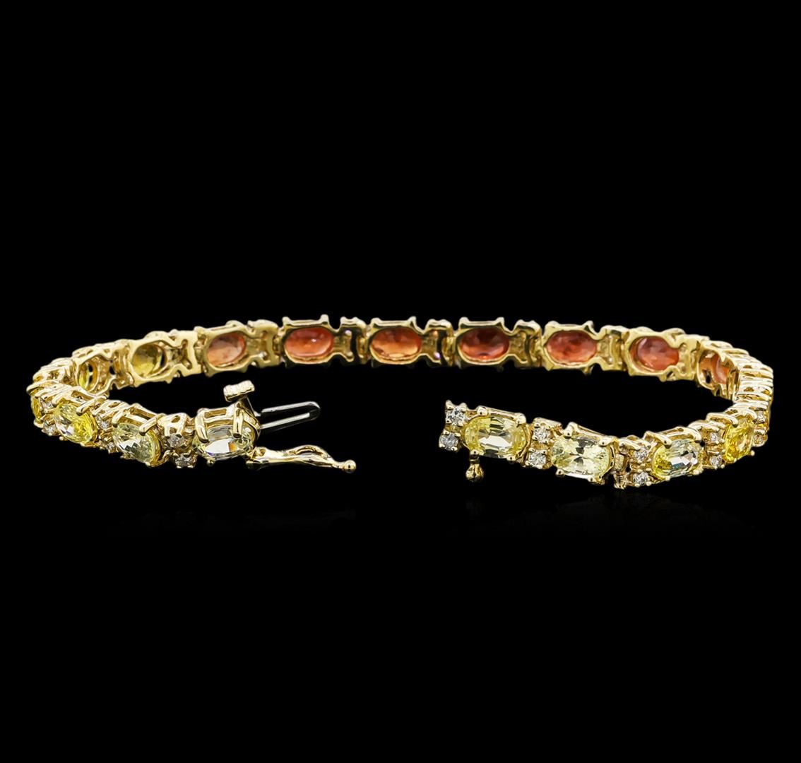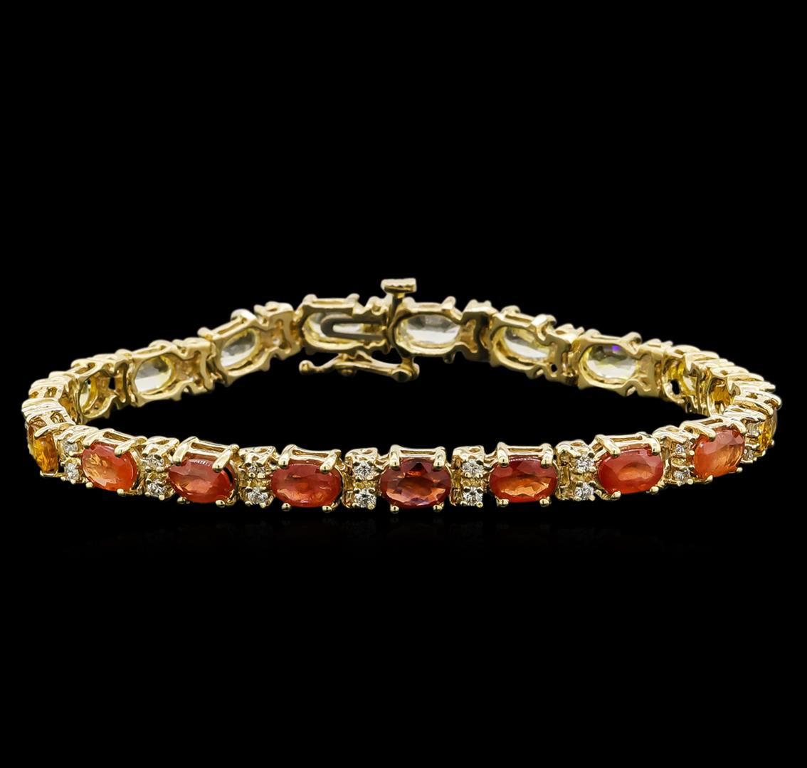 One electronically tested 14KT yellow gold ladies cast sapphire and diamond bracelet with a hidden box clasp with safety closer with a bright polish finish. Measurements: 7" in length Identified with markings of "14K". Condition is new. Containing: Eleven prong set oval modified brilliant cut natural yellow sapphires, measuring 5.90 x 4.20 x 2.74mm, approximate total weight of 6.27ct., clarity is eye clean, type II, medium light, brownish, yellow color, (GIA Y 4/3), cut is good. Eight prong set oval modified brilliant cut natural orange sapphires, measuring 5.90 x 4.20 x 2.73mm, approximate total weight of 4.56ct., clarity is slightly included, type II, medium, brownish, orange color, (GIA O 5/3), cut is good. Thirty-Eight prong set round brilliant cut diamonds, measuring 1.70 - 1.70 x 1.02mm (depth est.) approximate total weight of 38 Stones = 0.68ct. Clarity of SI-2 to I-1, Color of J - K, Cut is Good. Colored gemstones are presumed to have been subjected to commonly used enhancement processes. All diamonds and colored gemstones are graded in the mounting, unless otherwise stated. Total Weight of Colored Stones 10.83ct. Total Weight of Diamonds 0.68ct. Total Weight of Bracelet 13.80 grams. GGL Appraised at $4,785.00.