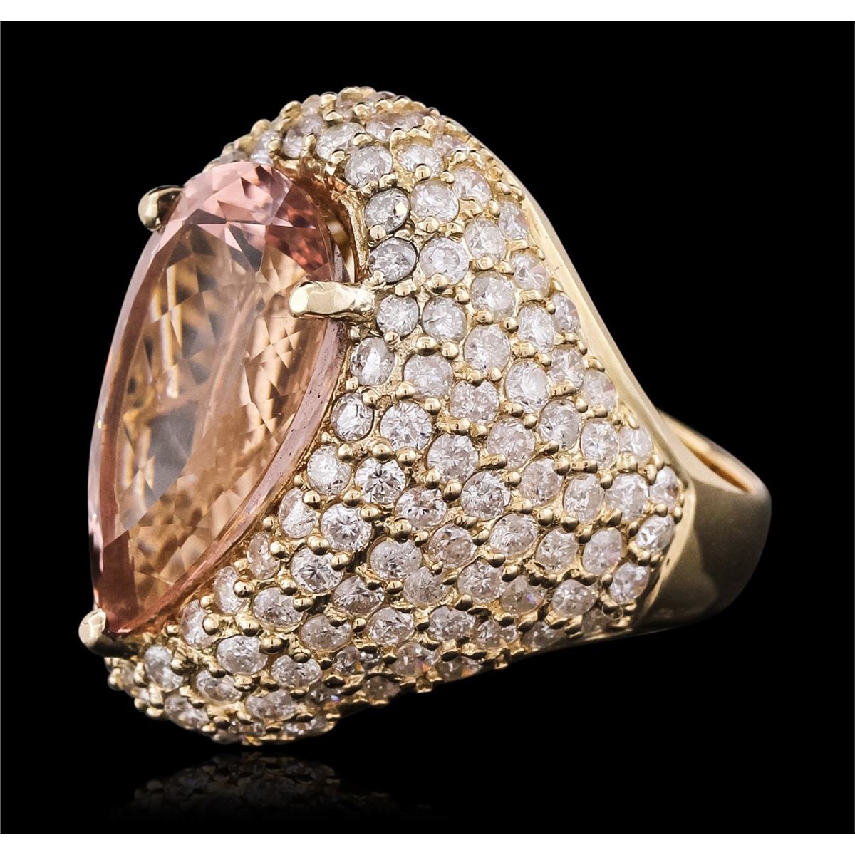 One electronically tested 14KT yellow gold ladies cast morganite and diamond ring with a bright polish finish. The featured morganite is set within an elaborate diamond set curvature, completed by a five millimeter wide band. Trademark is Orianne. Identified with markings of "14K". Condition is new, good workmanship. Containing: One prong set pear brilliant cut natural morganite, measuring 19.50 x 11.75 x 8.20mm, 6% bulge factor, approximate weight of 10.83ct., clarity is eye clean, type I, light, very slightly brownish, orangy red color, (GIA oR 3/3), cut is good. Transmitting light with no distortion, transparent. Colored Stone Grading Report attached. Graded in the setting. One Hundred Sixty prong set round brilliant cut diamonds, measuring 2.10 - 2.00 x 1.23mm (depth est.) approximate total weight of 160 Stones = 5.03ct. Graded in the setting. Clarity: SI-1 to I-1. Color: G - I. Total Weight of Colored Stones 10.83ct. Total Weight of Diamonds 5.03ct. Total Weight of Ring 14.51 grams. AIG Appraised at $23,560.00.