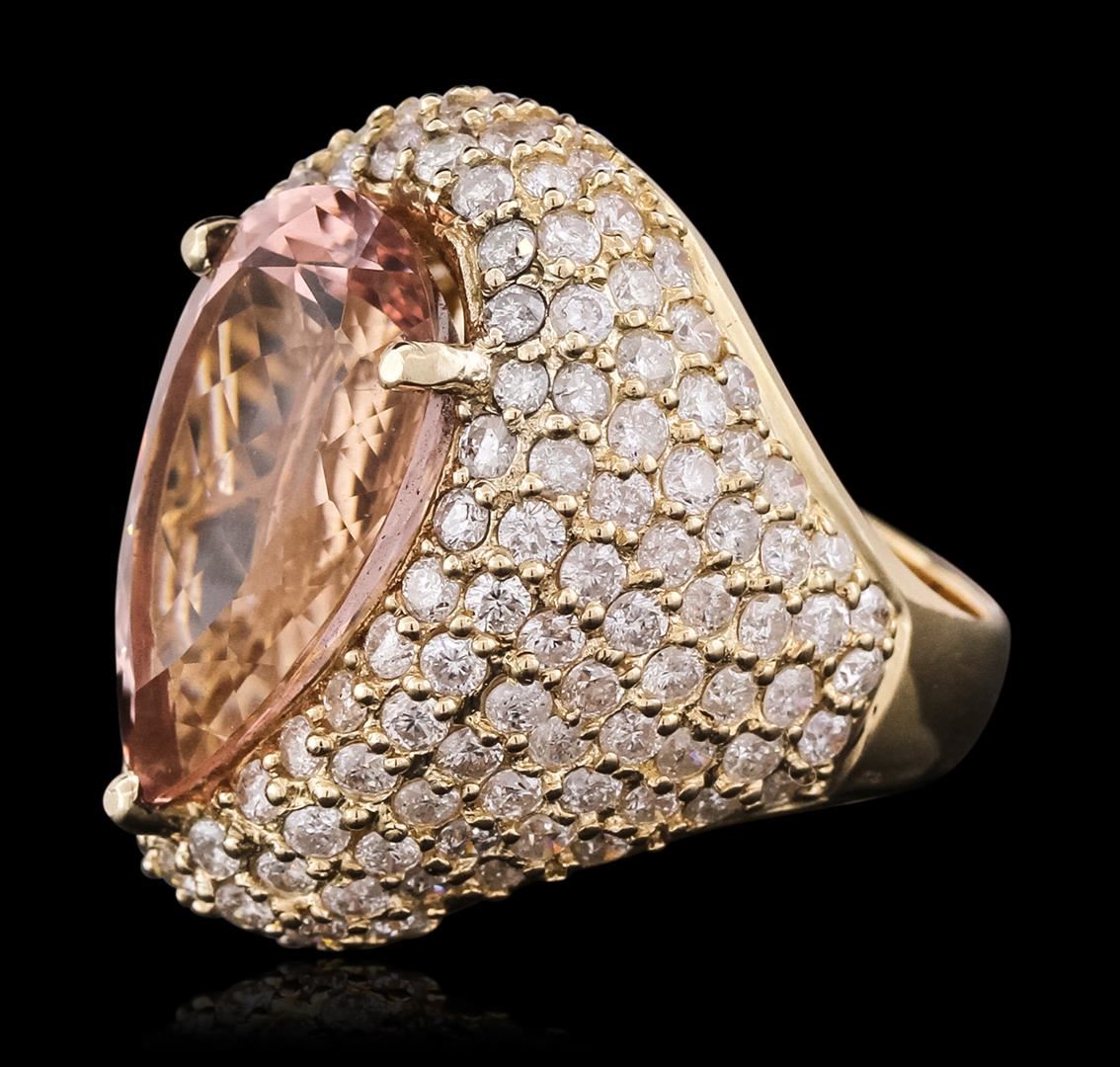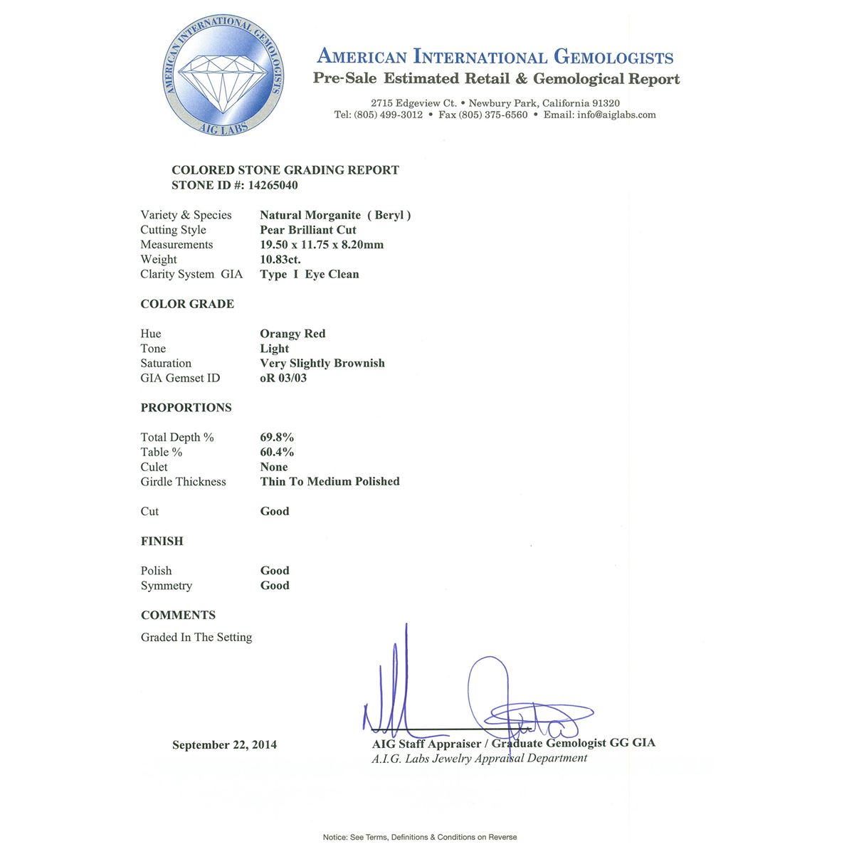 One electronically tested 14KT yellow gold ladies cast morganite and diamond ring with a bright polish finish. The featured morganite is set within an elaborate diamond set curvature, completed by a five millimeter wide band. Trademark is Orianne. Identified with markings of "14K". Condition is new, good workmanship. Containing: One prong set pear brilliant cut natural morganite, measuring 19.50 x 11.75 x 8.20mm, 6% bulge factor, approximate weight of 10.83ct., clarity is eye clean, type I, light, very slightly brownish, orangy red color, (GIA oR 3/3), cut is good. Transmitting light with no distortion, transparent. Colored Stone Grading Report attached. Graded in the setting. One Hundred Sixty prong set round brilliant cut diamonds, measuring 2.10 - 2.00 x 1.23mm (depth est.) approximate total weight of 160 Stones = 5.03ct. Graded in the setting. Clarity: SI-1 to I-1. Color: G - I. Total Weight of Colored Stones 10.83ct. Total Weight of Diamonds 5.03ct. Total Weight of Ring 14.51 grams. AIG Appraised at $23,560.00.